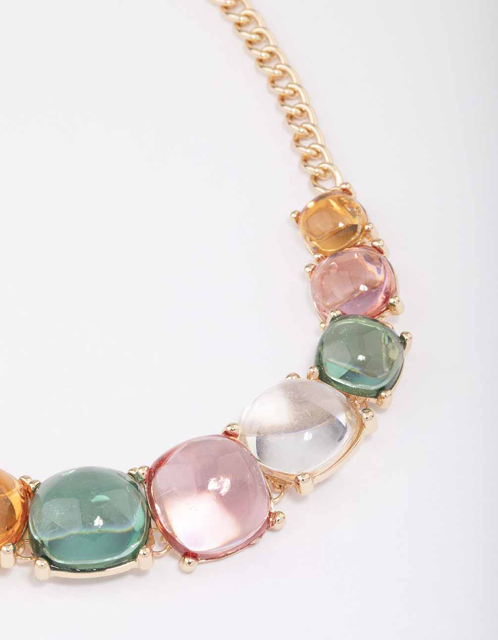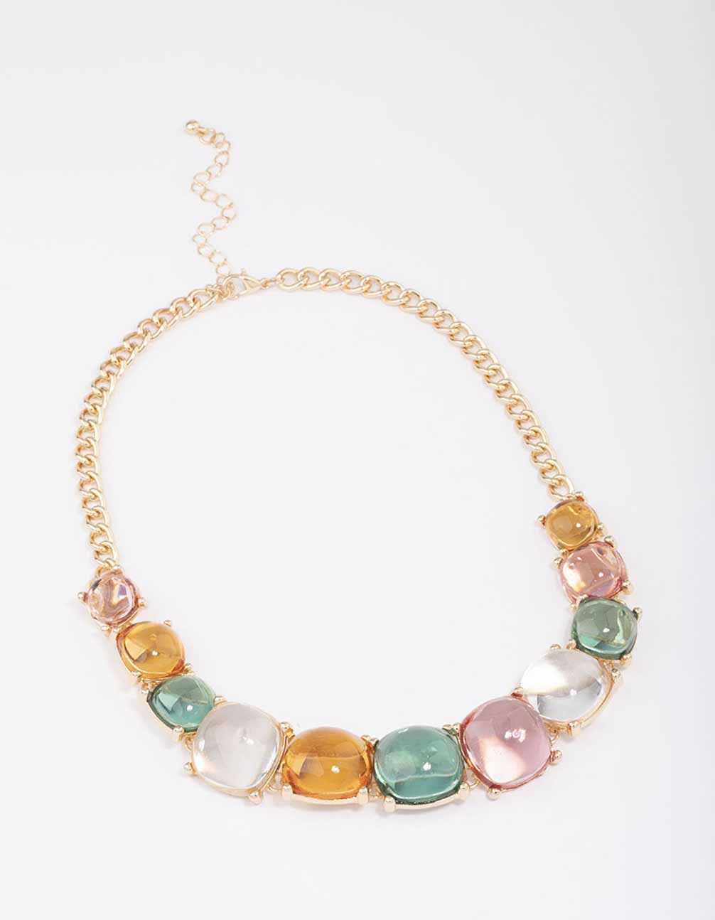 This unique gold chain is adorned with large, graduating stones in a range of pink, green and amber colours for a vibrant finish.