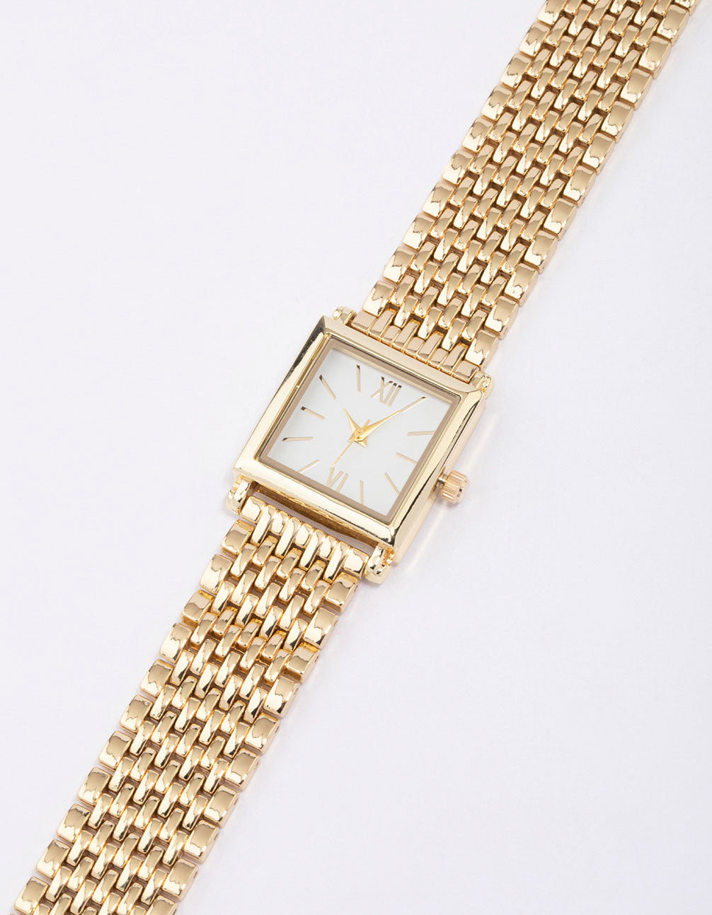 This gold watch features a small white face and classic gold band for a refined look. Pair this watch with matching gold bracelets for a personalised touch.