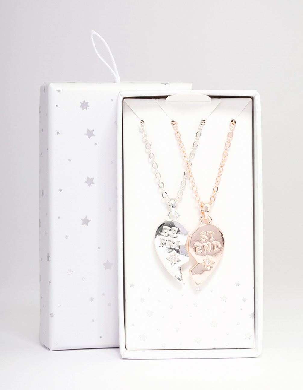 This gift box contains two individual pendant necklaces adorned with two halves of a heart etched with the words 'Best Friend.'