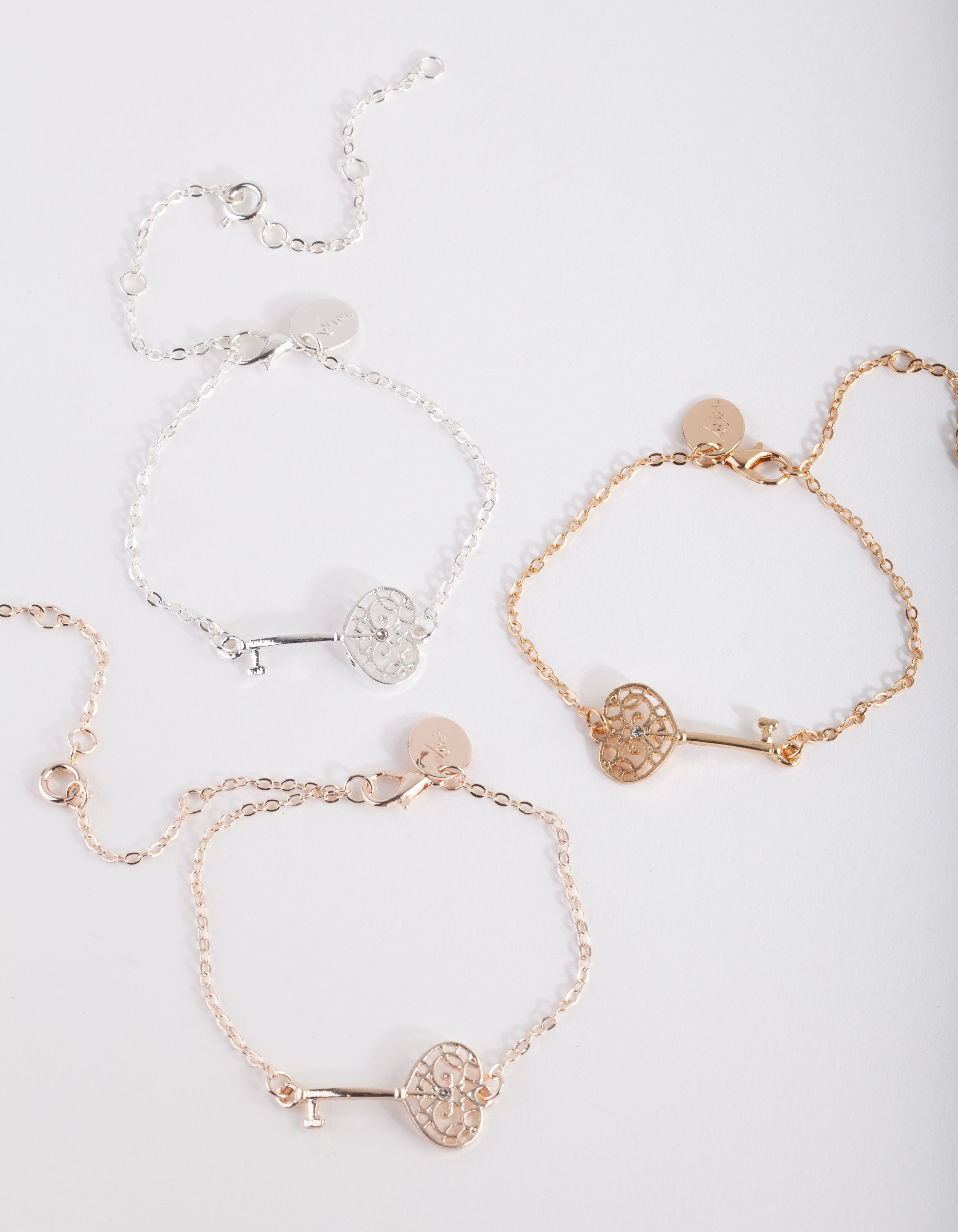 Shareable, giftable and packed in pretty packaging. Lovisa gift-boxes take the stress out of gift giving. This mixed metal filigree key set comes with three bracelets that can also be worn as anklets using the extender chain. Keep them all for yourself or give some to your bestfriends!
