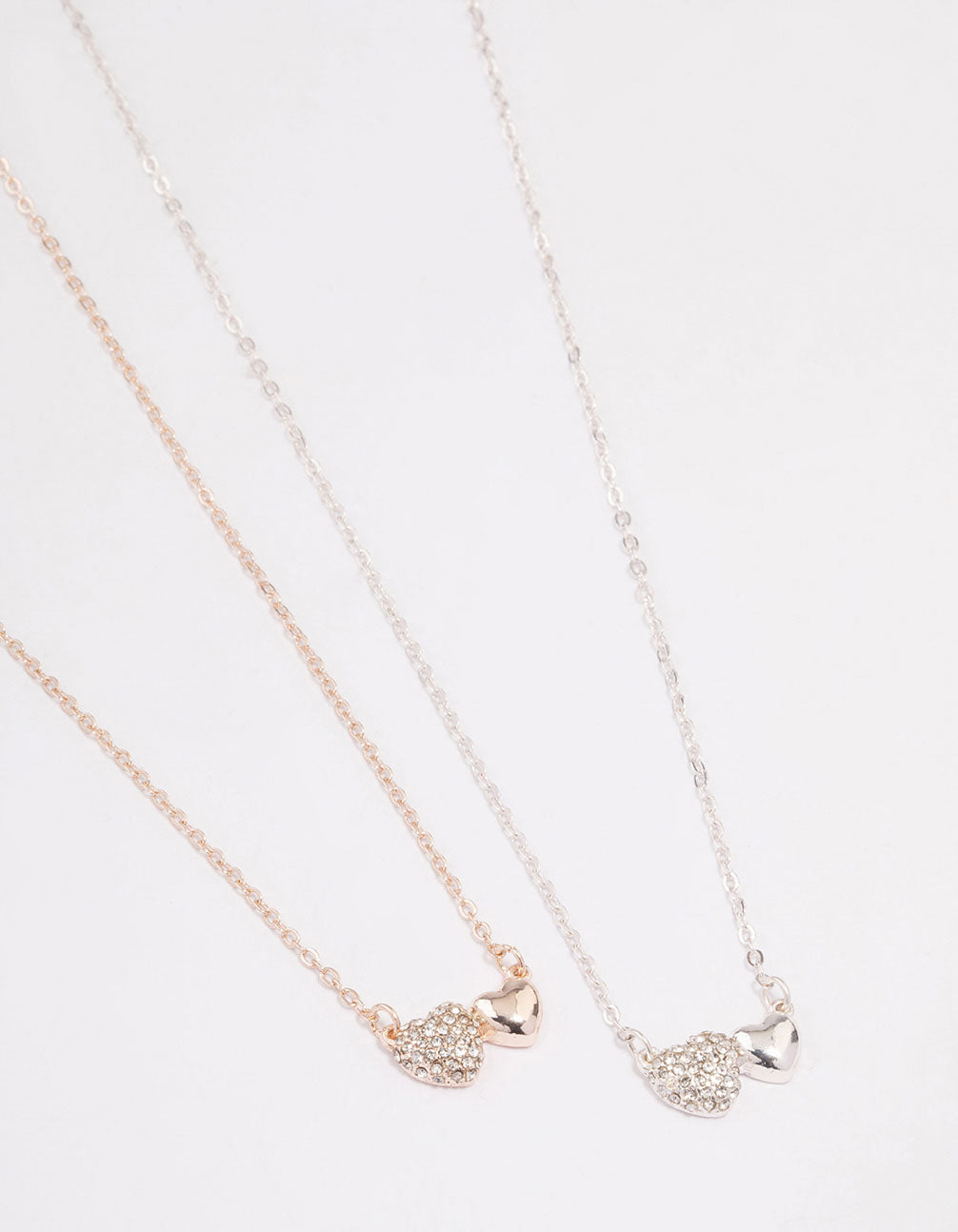 This gift box contains two individual pendant necklaces adorned with diamante encrusted heart charms in gold and silver settings.