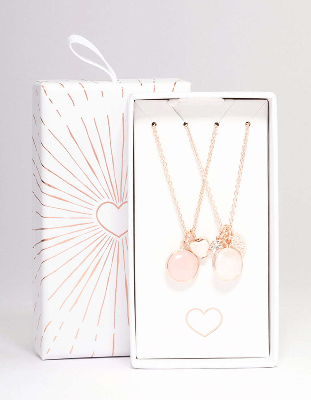 This gift box contains two rose gold pendant necklaces with semi-precious charms for a unique finish.