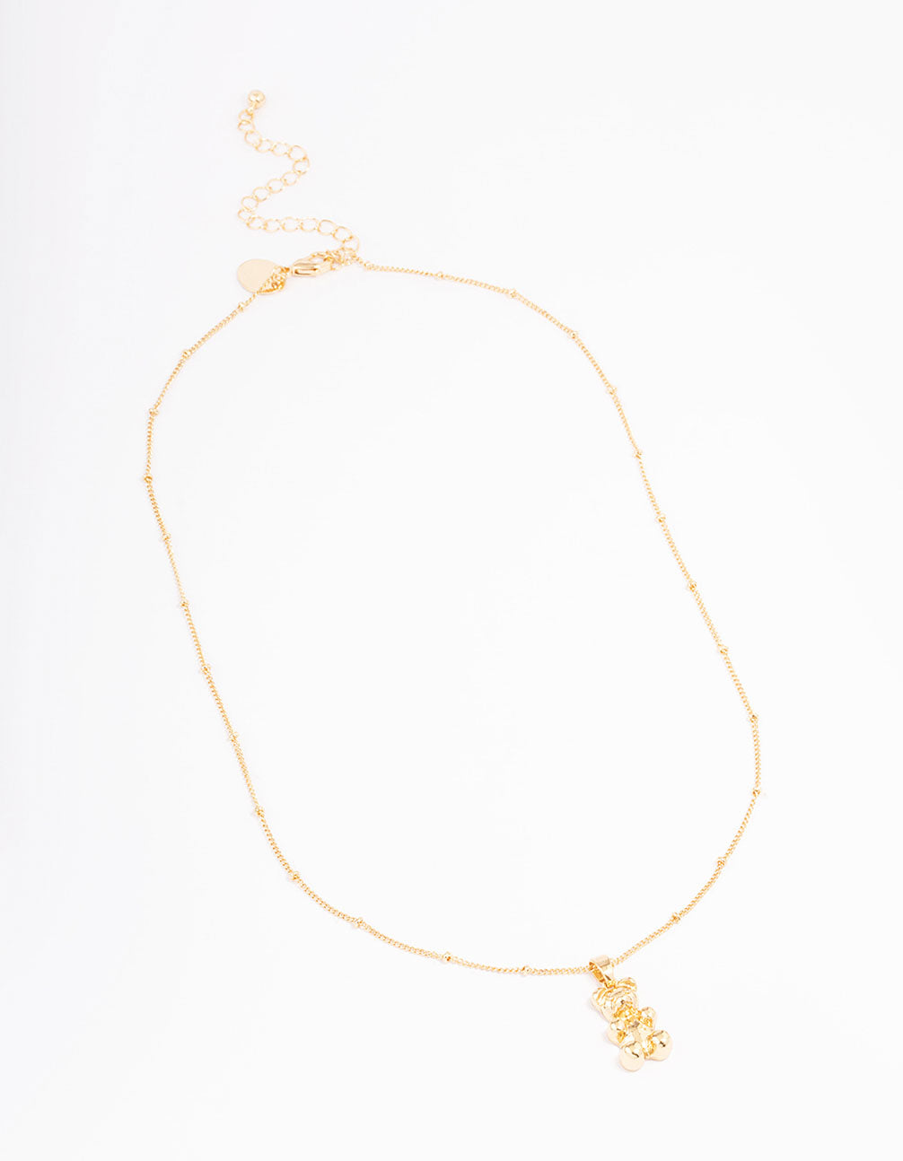 This gift box contains a genuine gold plated station necklace adorned with a simple teddy bear pendant.