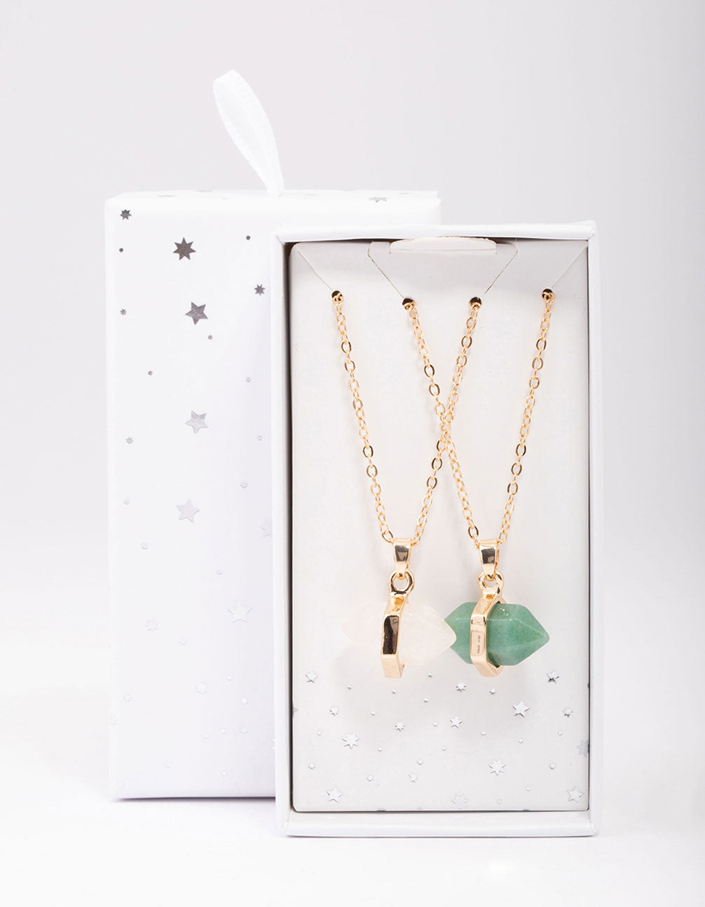 - This gift box contains two gold necklaces featuring semi-precious stones for a natural look.