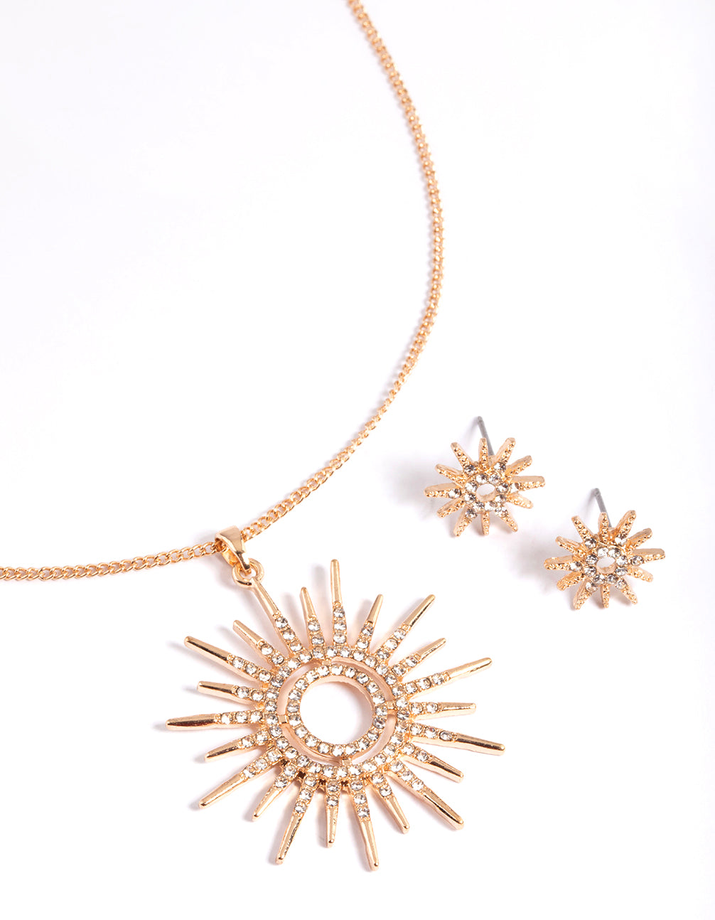 Gold Statement Diamante Sun Necklace & Stud Earrings