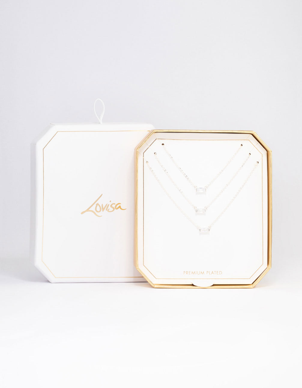 - This gift box contains a silver plated layered necklace adorned with simple baguette cut crystals for a modern feel.