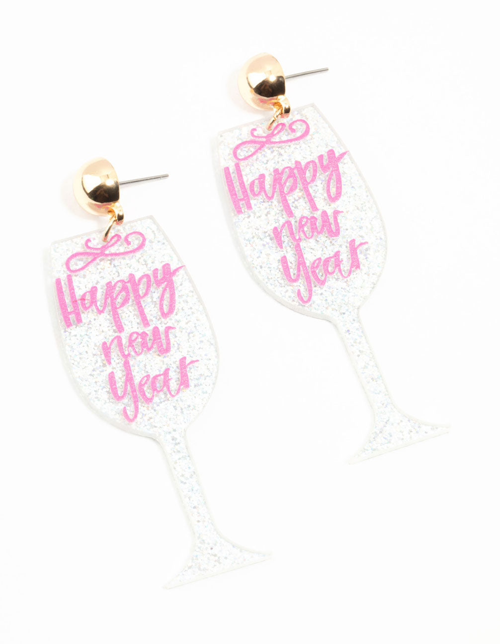 Get ready for New Year's Eve with these stunning Happy New Year Glass Acrylic Drop Earrings. Add a touch of celebratory style to any outfit with these vibrant glittery earrings. Perfect for welcoming the new year.