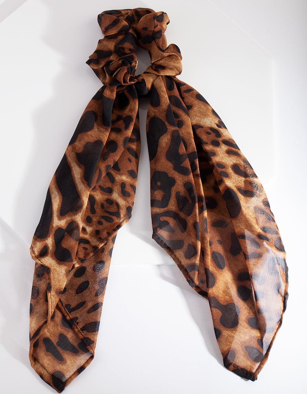 Scrunchies are back! Add some fun to your hair looks with a classic scrunchie! This scrunchie scarf boasts a neutral leopard print design.