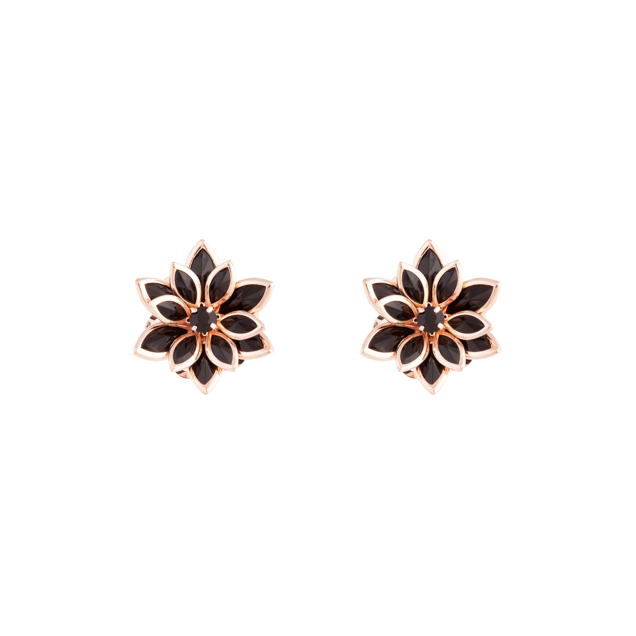 Flower Power! These flower shaped earrings are rose-gold-toned with a black diamante in the centre. Elevate your style by matchings these earrings with gold accessories with black detailing.