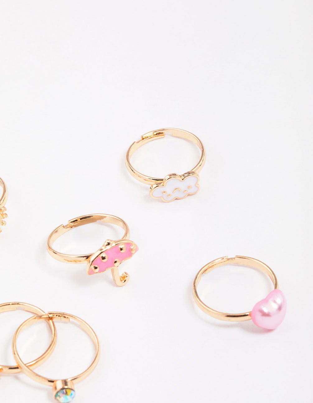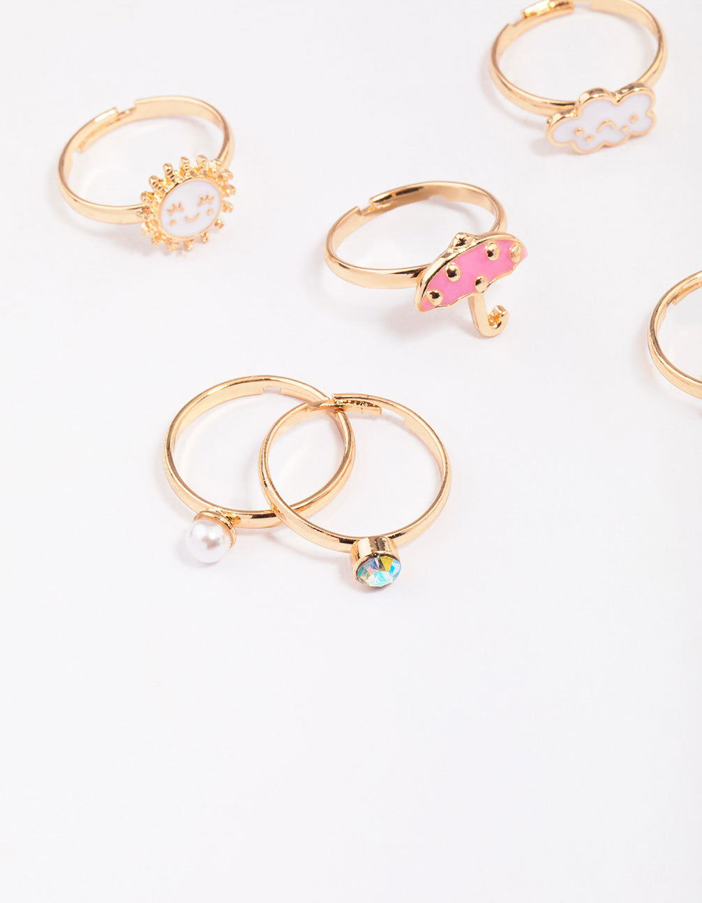 This ring pack includes six adjustable rings, designed with adorable mushroom and cloud motifs for a pop of colour.