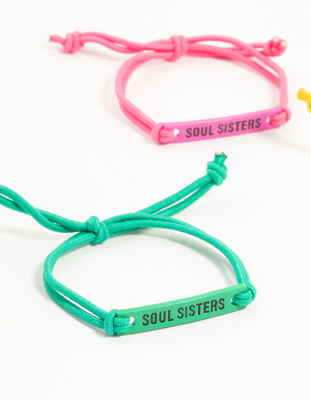 Let the little ones spread the love with this charming bracelet set! Featuring five colourful bracelets in pink, orange, yellow, purple, and green, each with "soul sister" on them. Perfect for showing they care.