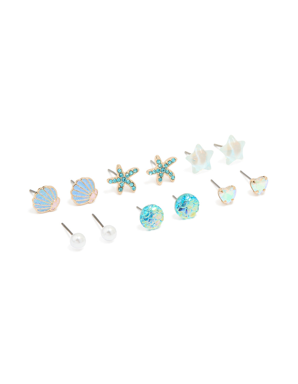 Add a touch of seaside sparkle with this Kids Glitter Gold Sea & Starfish Stud Earrings Pack! This playful set is perfect for young style icons who love ocean-inspired accessories. Featuring six pairs of stud earrings, it includes glittery blue shell studs, dazzling blue diamante starfish earrings, charming blue-and-white star studs, elegant pearl earrings, shimmering mermaid scale studs, and adorable heart studs. Designed with a gold-tone finish, these lightweight and stylish earrings are ideal for holidays, beach days, or everyday wear. Pair them with summer dresses, casual tees, or even party outfits for an effortlessly fun look. Perfect for kids who adore seaside vibes!