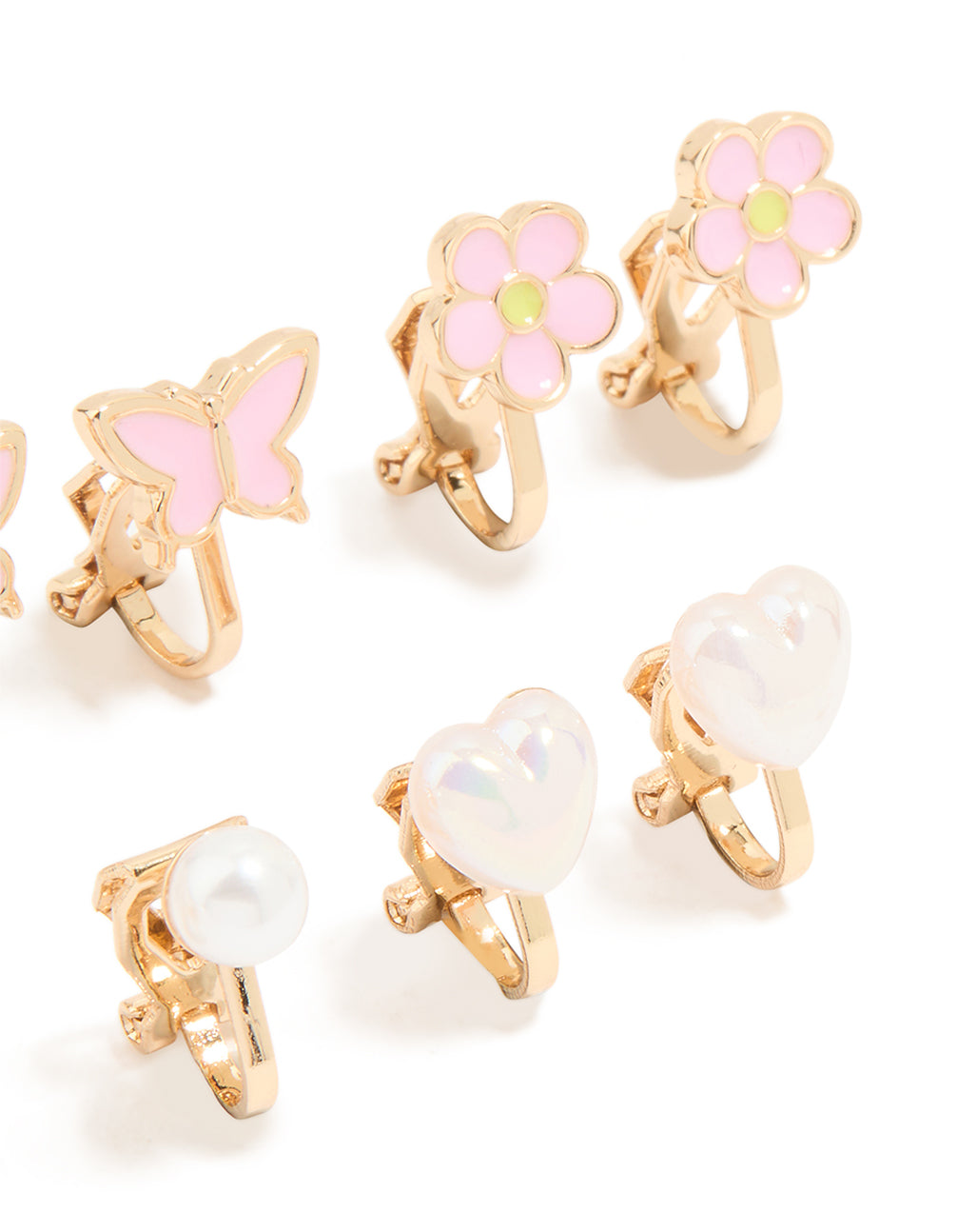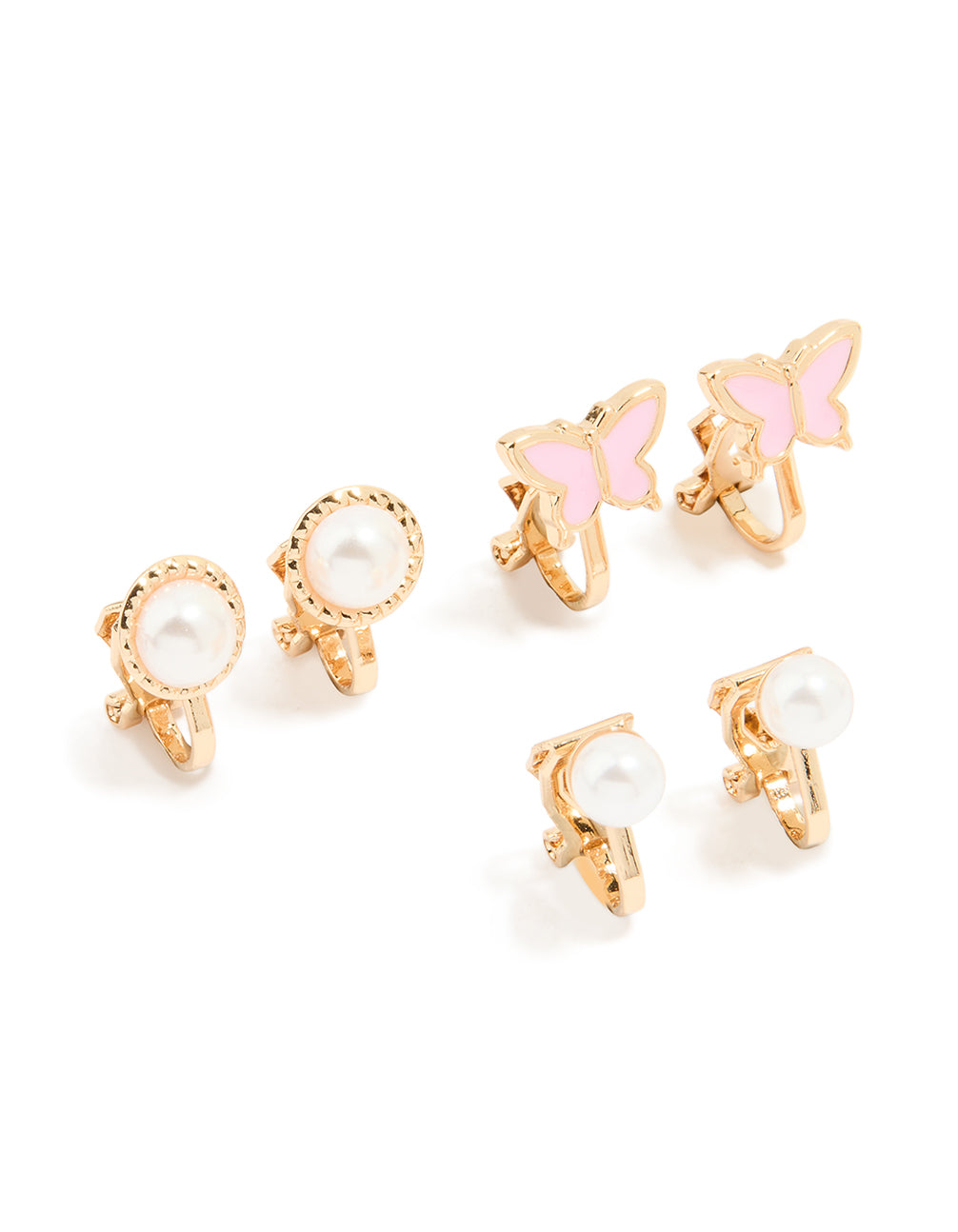 Kids Gold Pearl & Butterfly Clip On Earrings 5-Pack