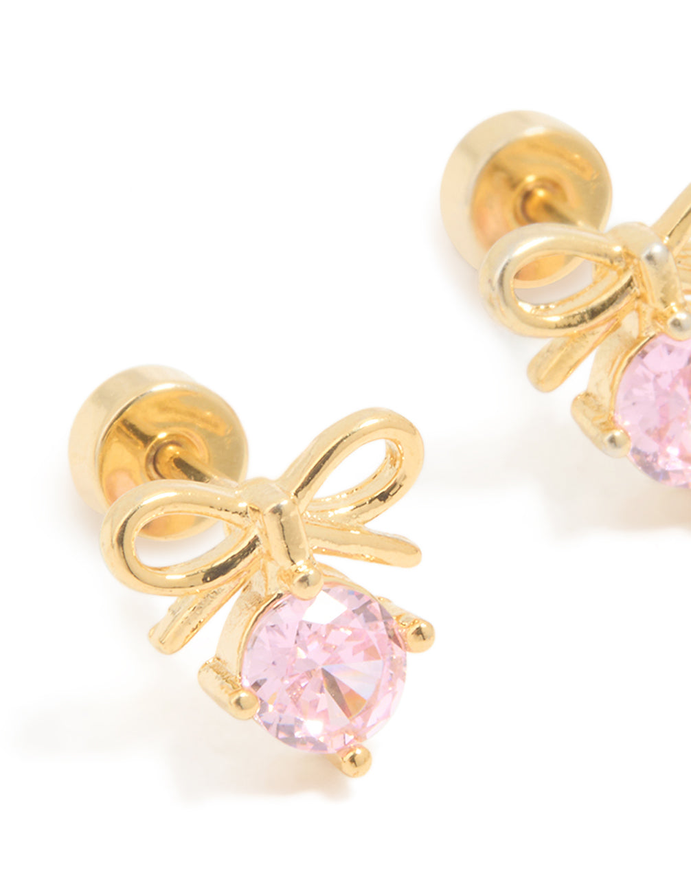 Kids Gold Plated Surgical Steel Pink Cubic Zirconia Bow Flat Back Earrings