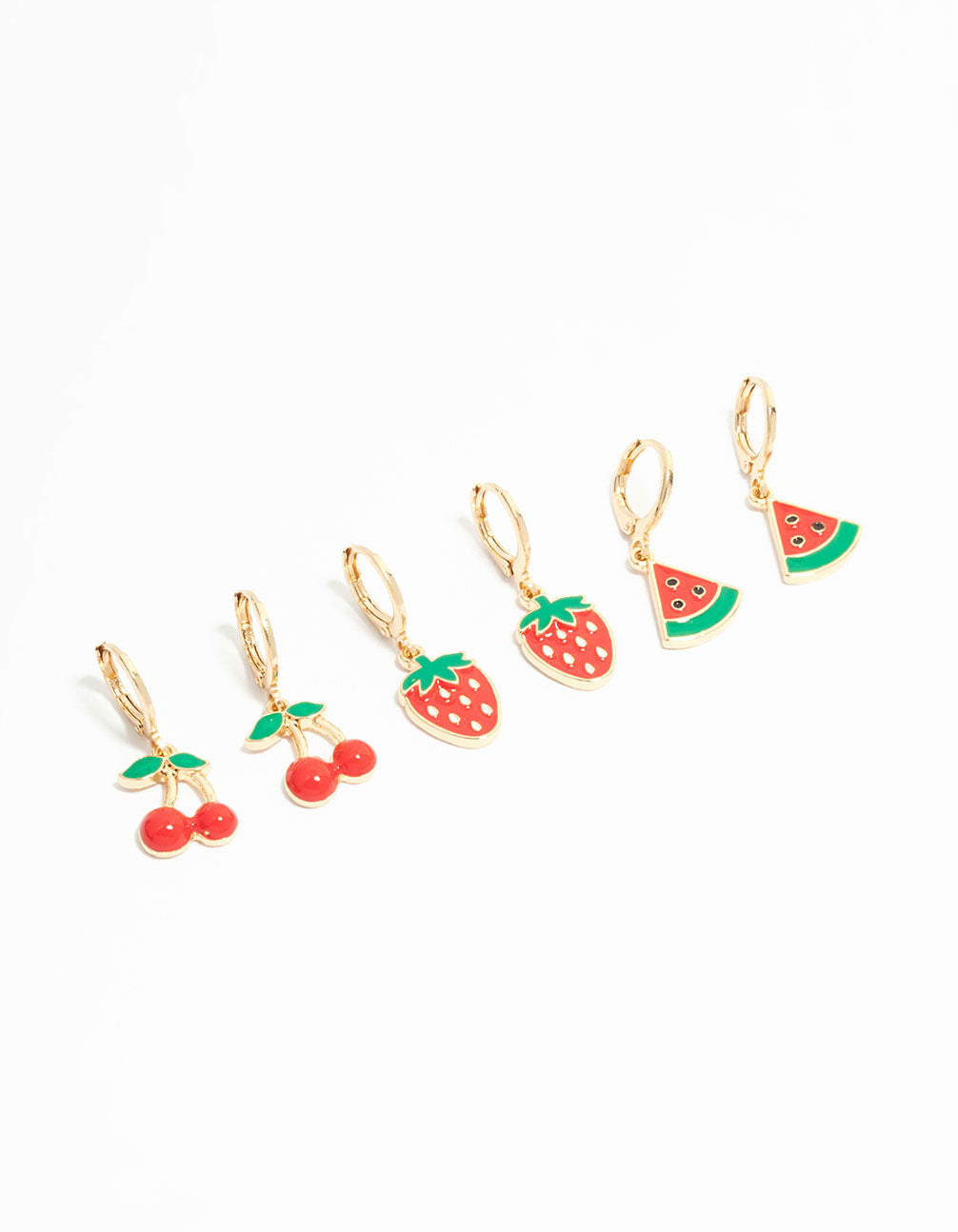 Add a pop of playful charm to your look with this Kids Gold Tutti Frutti Huggie Earrings Pack. Perfect for kids or anyone who loves fun, fruity style, this set of huggie earrings features a mix of adorable fruits including cherries, strawberries and watermelons. Crafted with a shiny gold finish, these lightweight earrings are ideal for everyday wear or for adding a splash of personality to party outfits. Pair them with a casual dress for a quirky daytime vibe or with a bright top for a cheerful, statement look. Whether you're dressing up for a birthday bash or just want to bring some fun to your accessories, these earrings are an easy win!