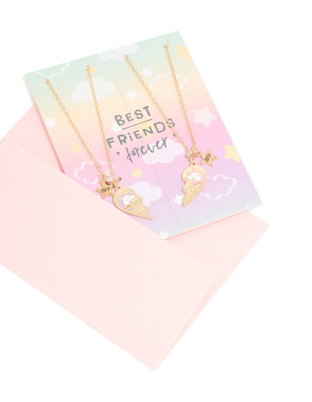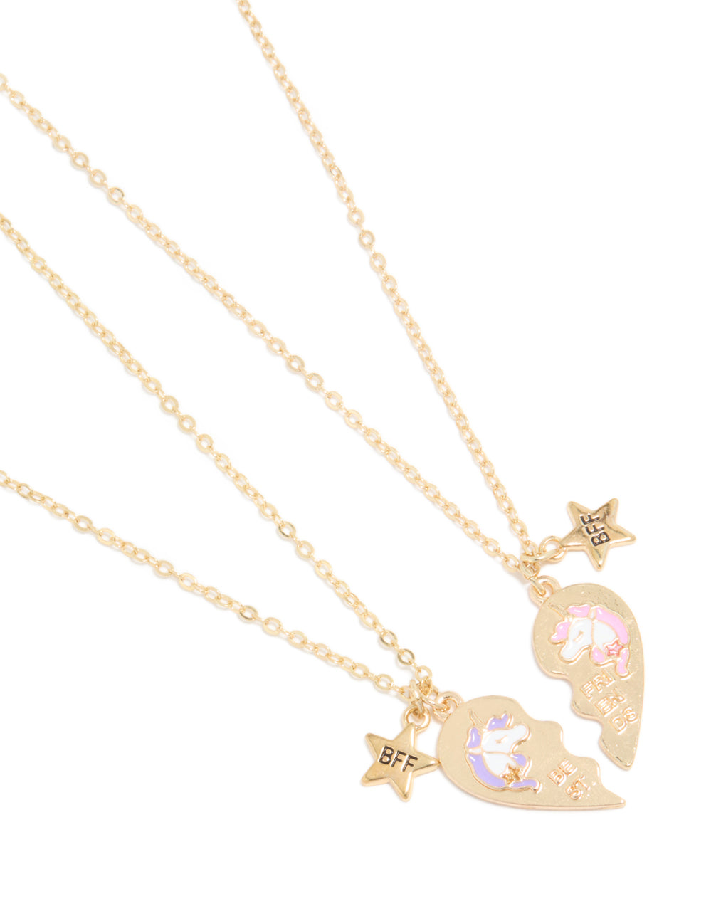 Celebrate magical friendships with this Kids Gold Unicorn BFF Heart Necklace Pack! Perfectly designed for kids, this adorable jewellery set includes two gold-toned necklaces, each featuring half of a heart. One necklace showcases a purple-haired unicorn with the word "best" and a sweet star charm engraved with "BFF". The other necklace features a pink-haired unicorn with the word "friends" and a matching "BFF" star charm. These charming necklaces are perfect for sharing with your bestie and make a fun, stylish way to show off your special bond. Ideal for school, birthday parties, or playdates, they pair perfectly with everything from casual outfits to party dresses. A magical gift for any unicorn-loving duo!