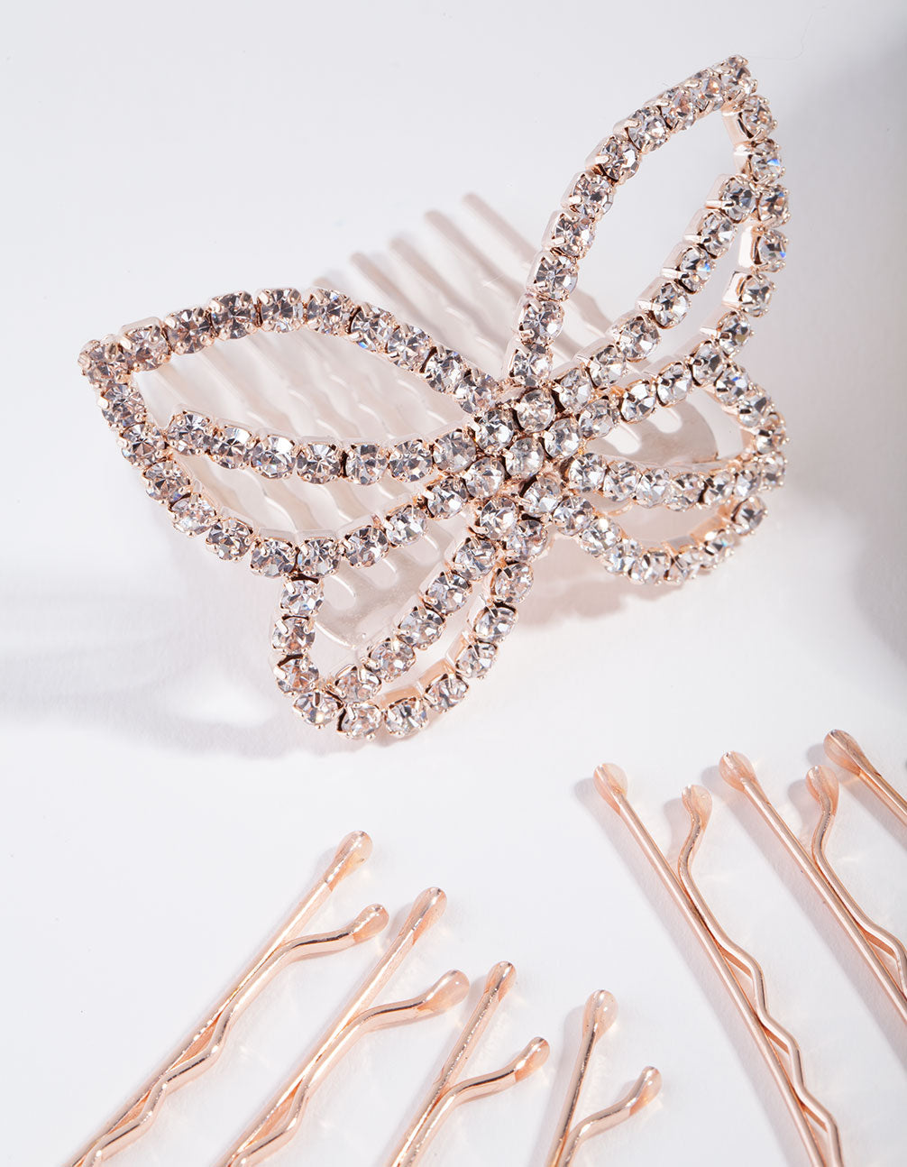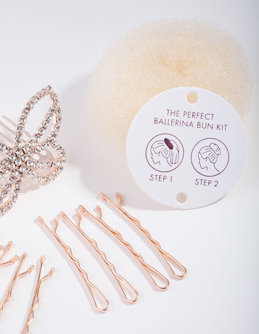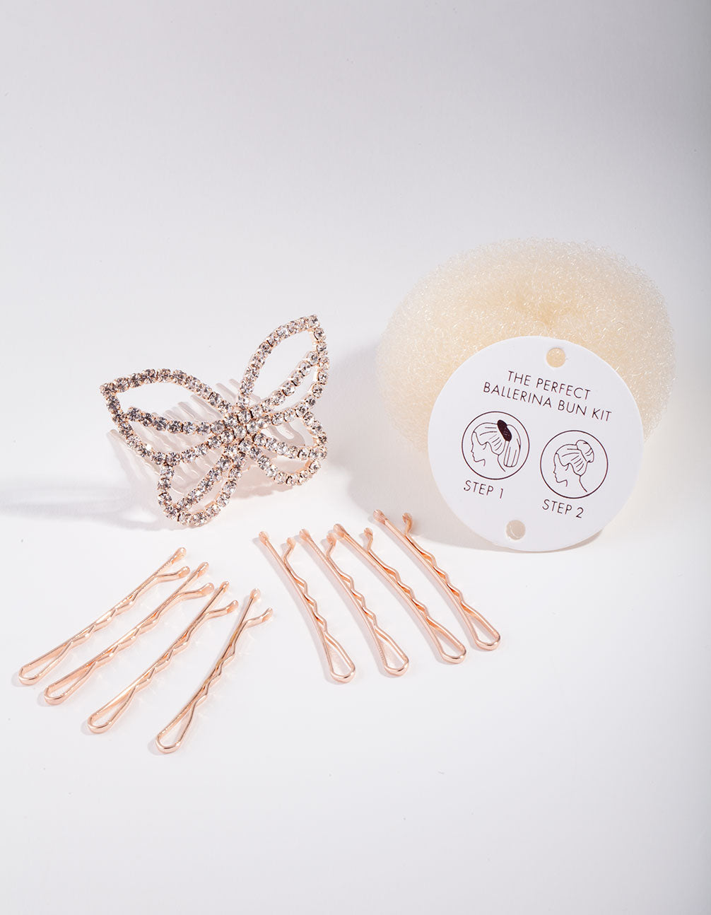 Hair style = sorted! This kids rose-gold-toned hair pack includes a dramatic diamante butterfly clip, bun hair-styler and bobbie pins to hold it all in place. This pack is all you need to create a fabulous dressy bun look.