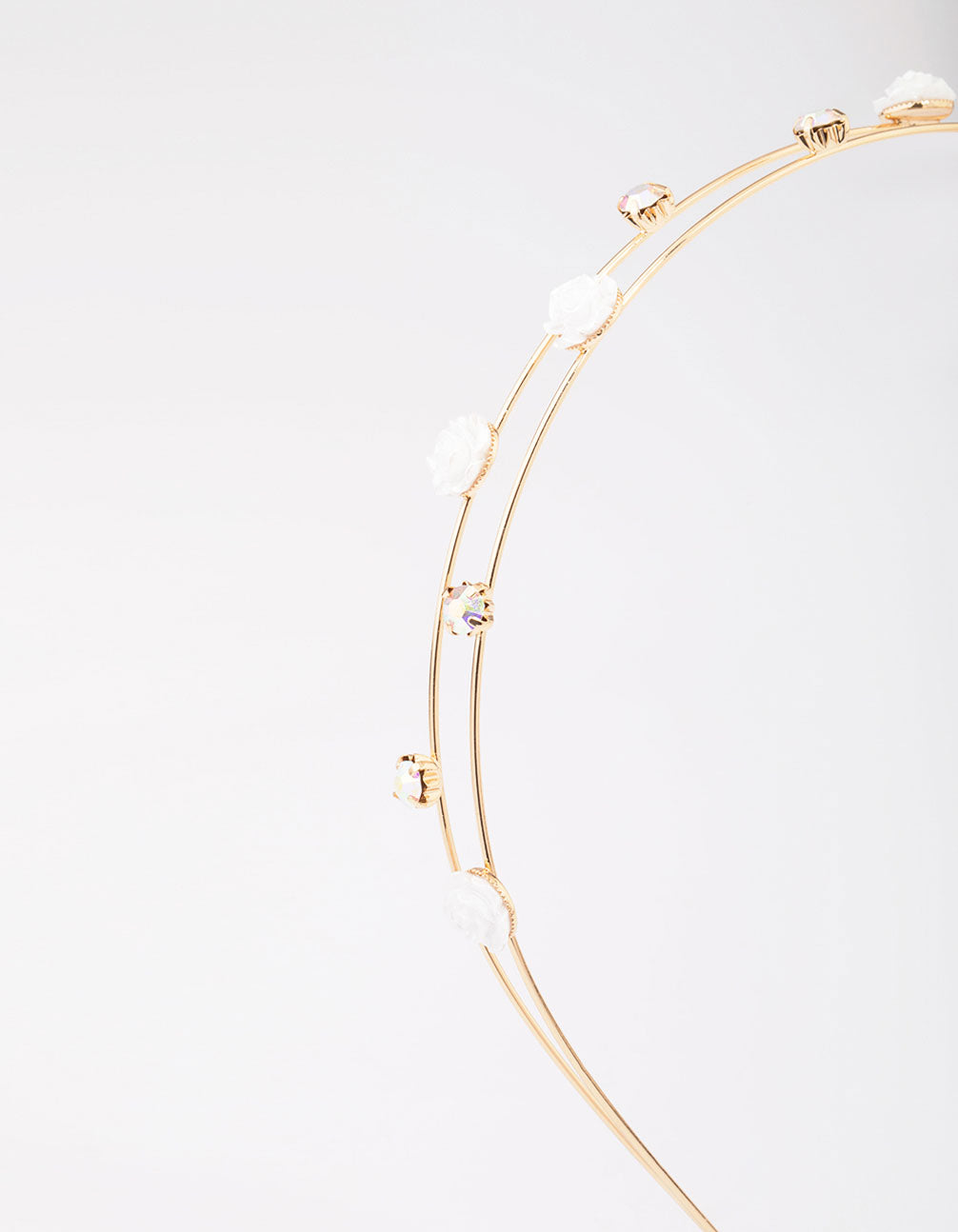 Add interest to your little ones hairstyle with this gorgeous, gold-toned headband. This dainty headband features a collection of white flowers, encrusted with delicate diamantes for a touch of glamour.