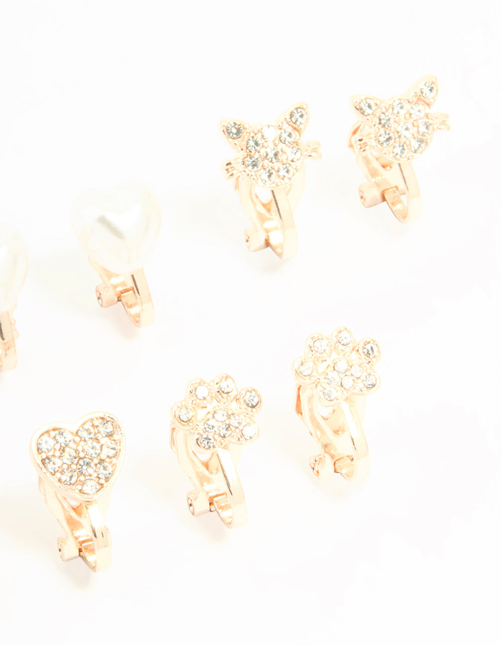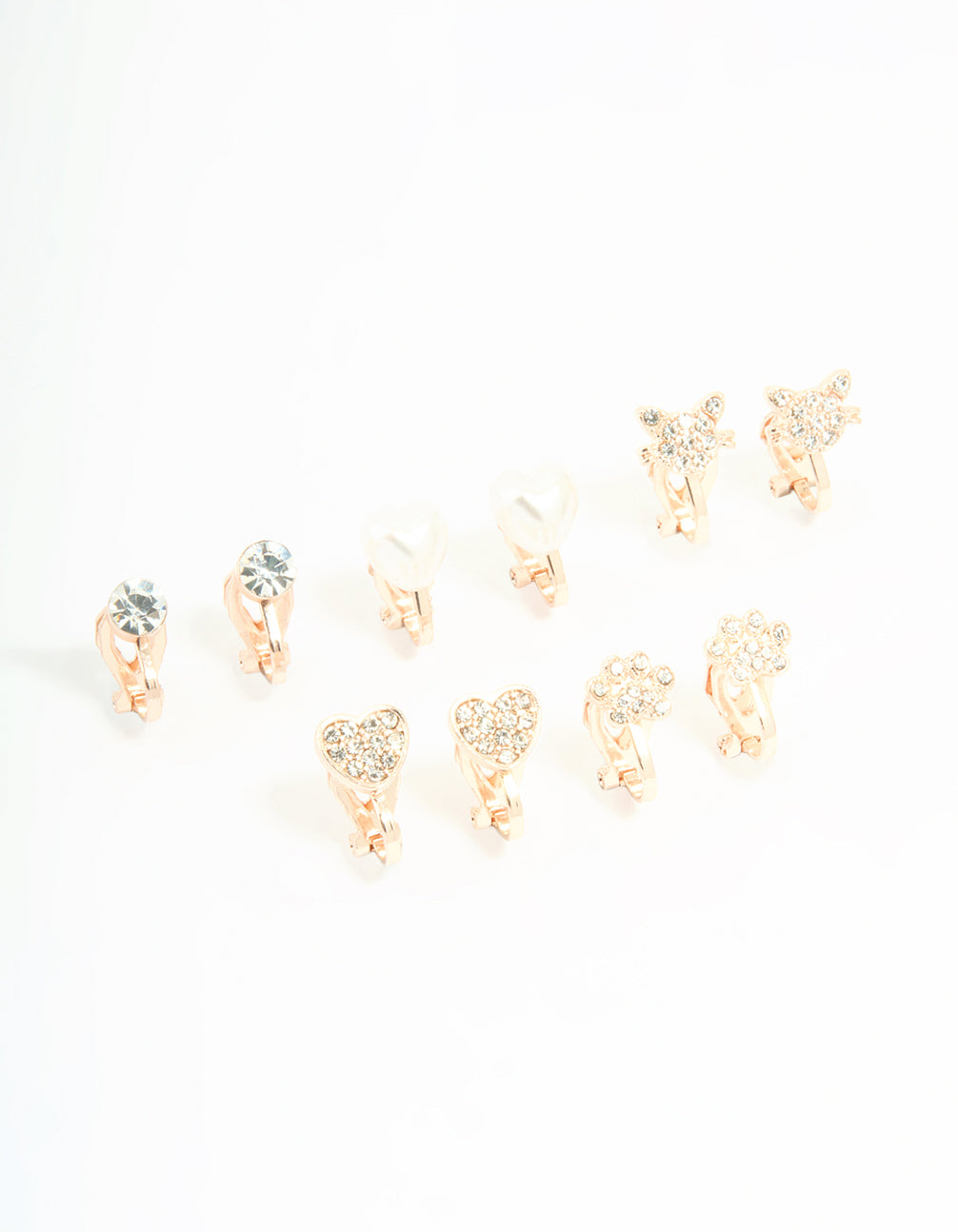 Kids Rose Gold Diamante Heart & Flower Clip On Earrings 5-Pack