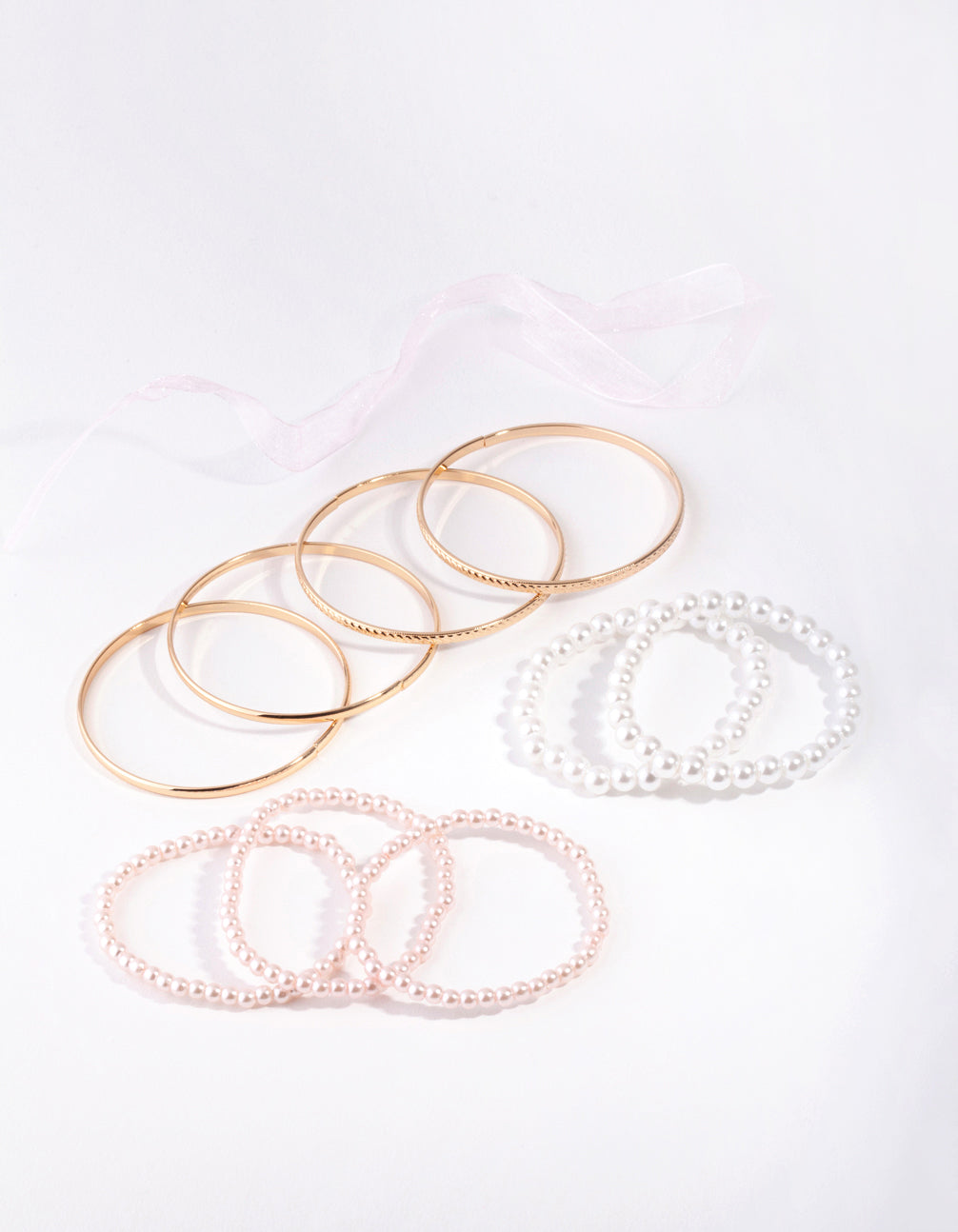 There is nothing more fun than dressing up in gold, pink and pearls! This 8-pack of bangles and bracelets includes pink and cream faux pearls and gold-toned bangles. Perfect for a dressier event or to glam-up a casual kid look!