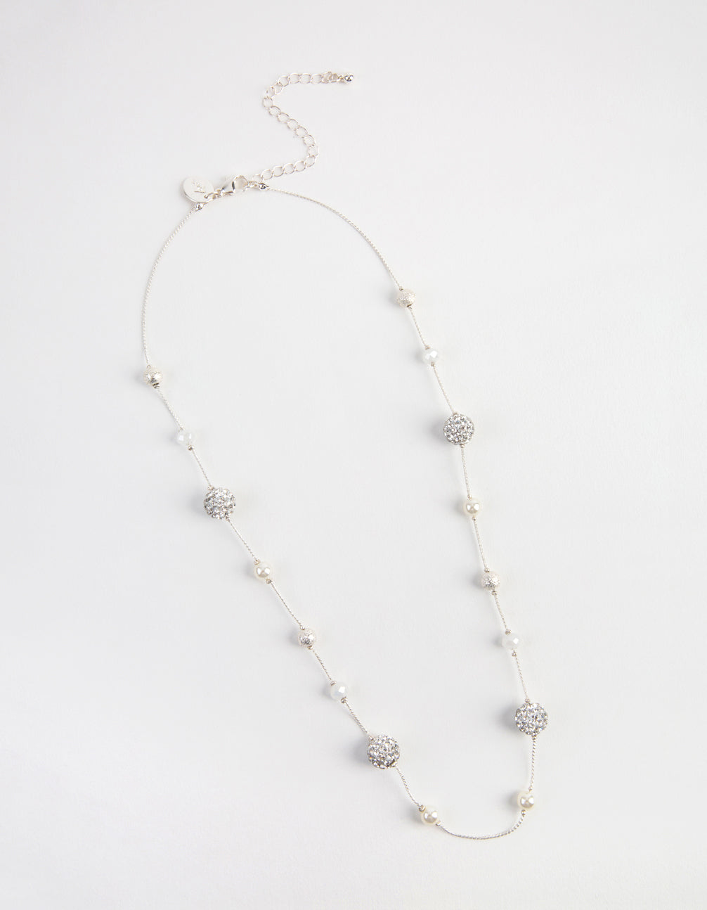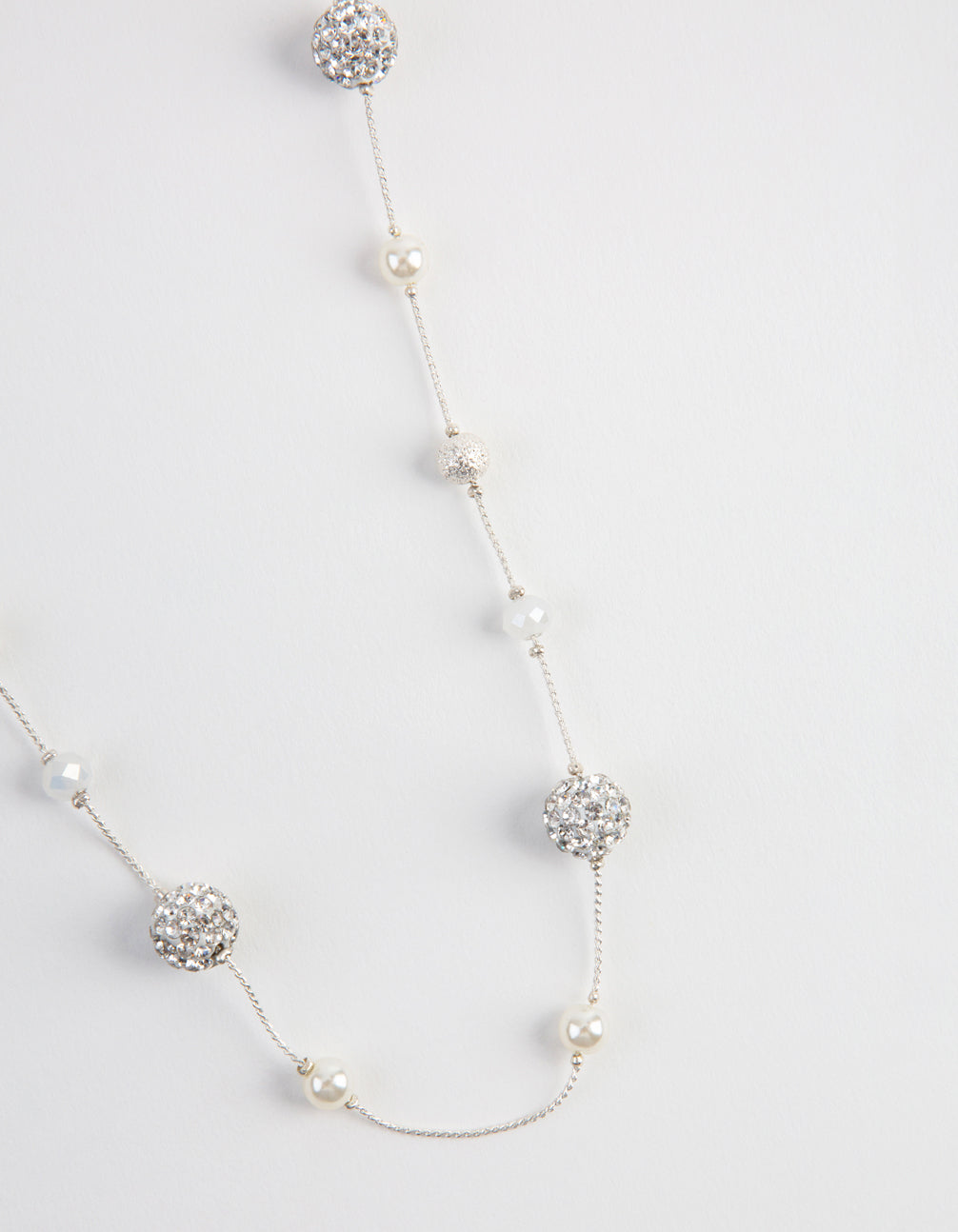 This gorgeous necklace features faux pearls, clear stones and diamante studded beads arranged on a silver-toned chain.