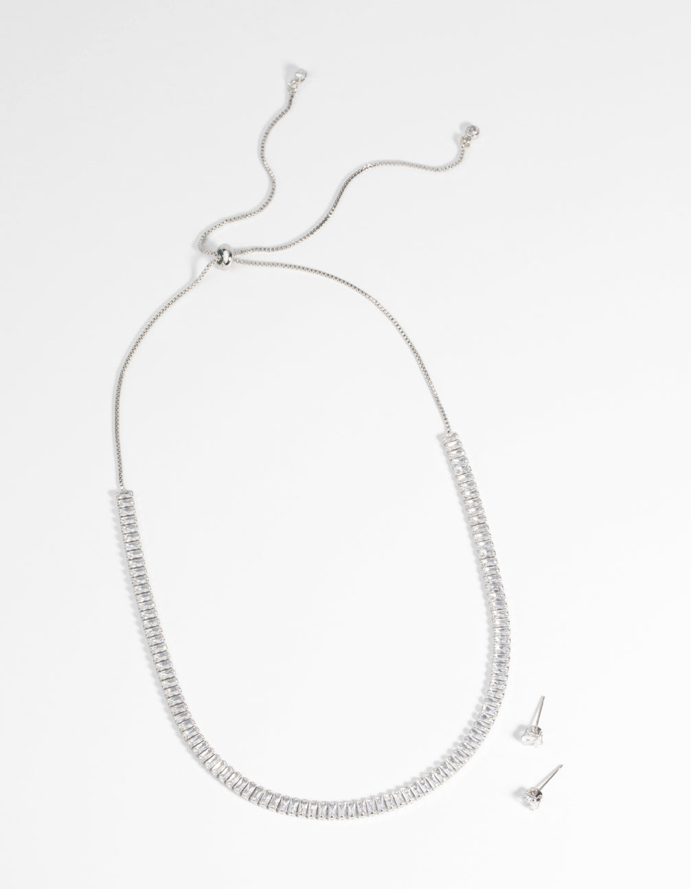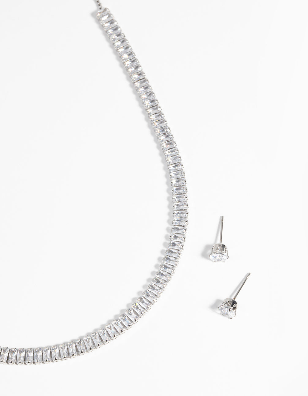 Silver Diamond Simulant Baguette Necklace & Earrings Set