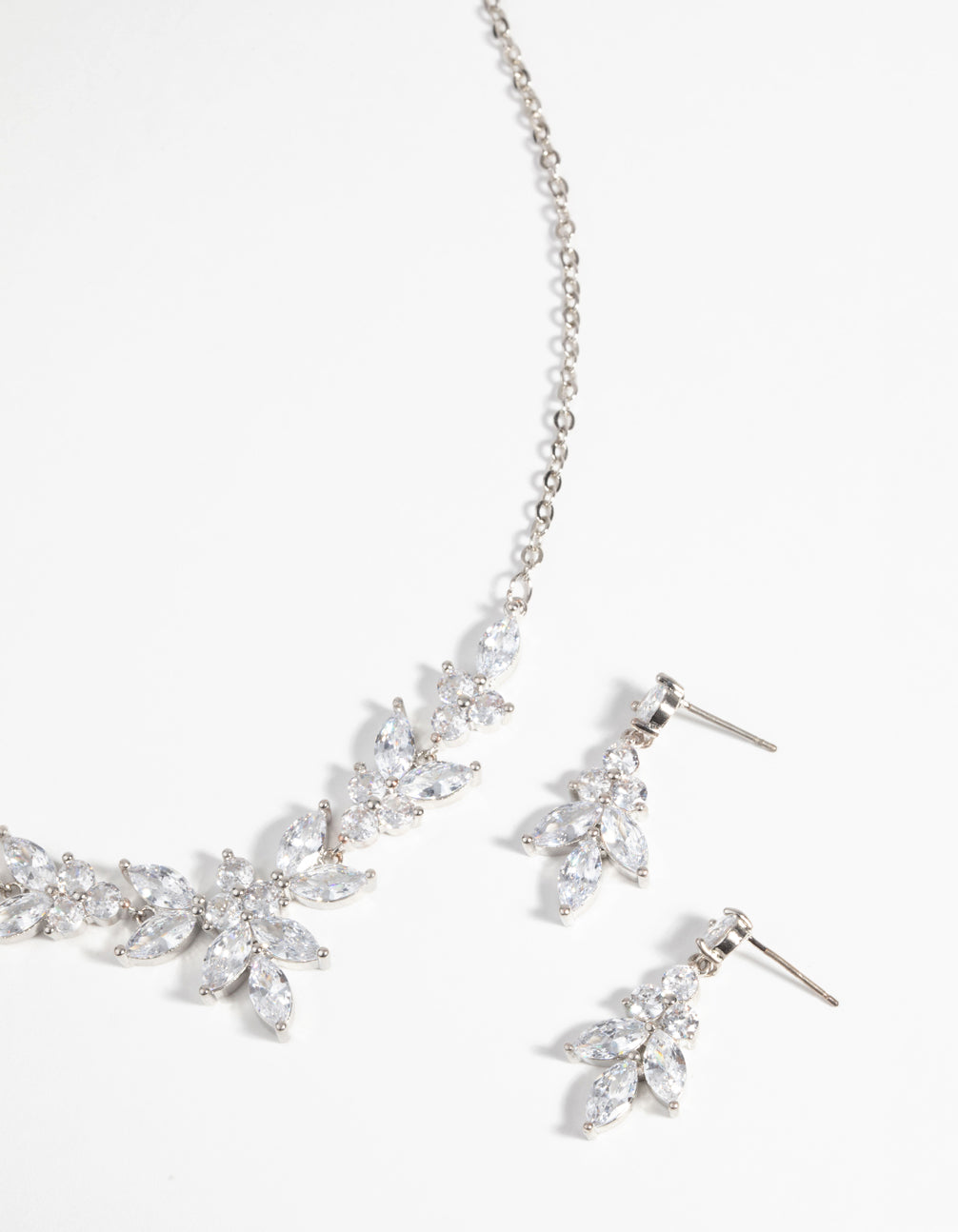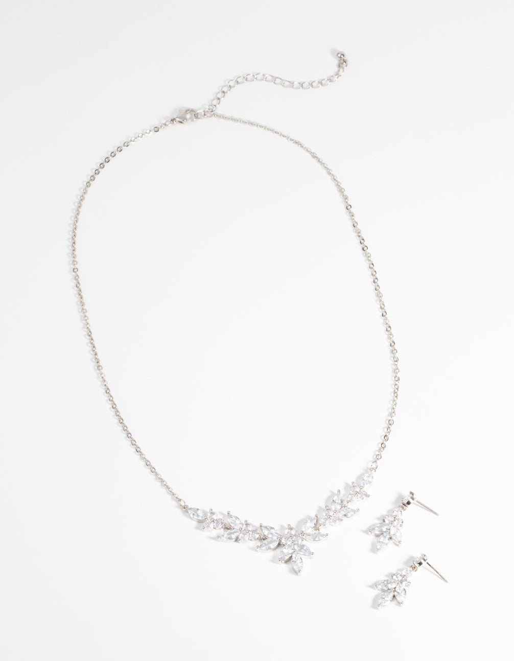 Silver Diamond Simulant Navette Necklace & Earrings Set