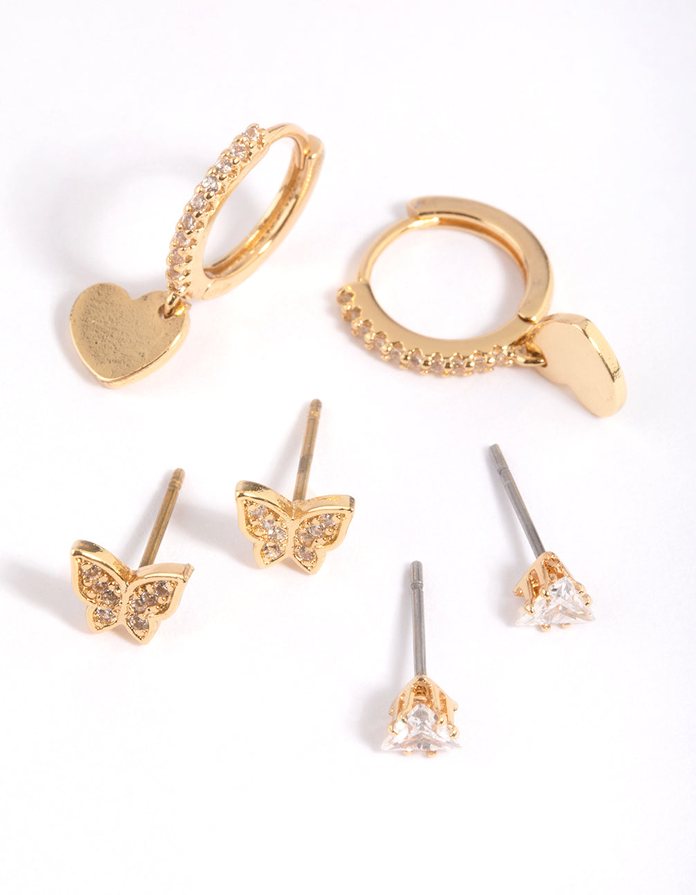 Gold Plated Brass Butterfly & Heart Earring Stack 6-Pack