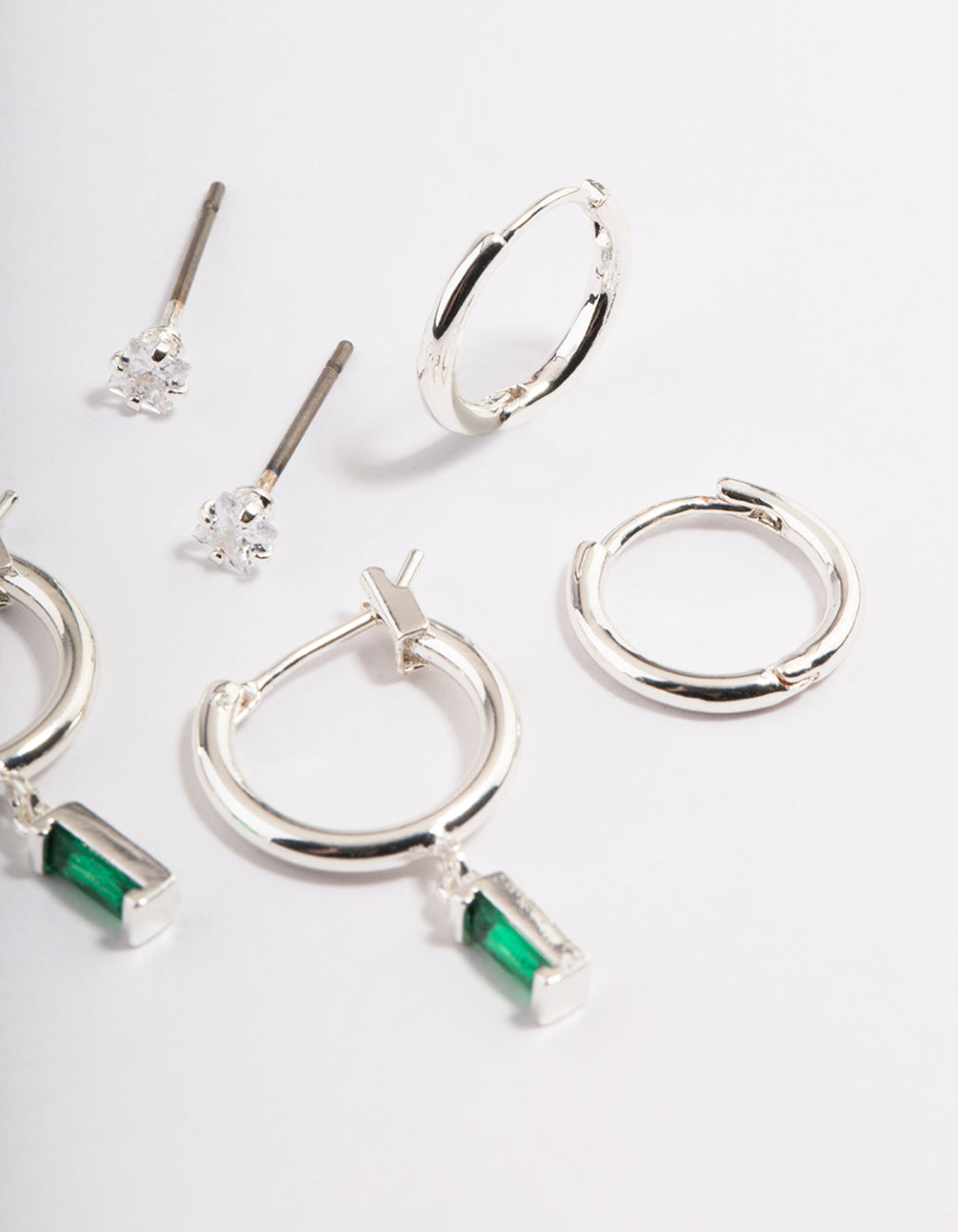 Silver Plated Brass Cubic Zirconia Emerald Cut Huggie Earrings 6-Pack