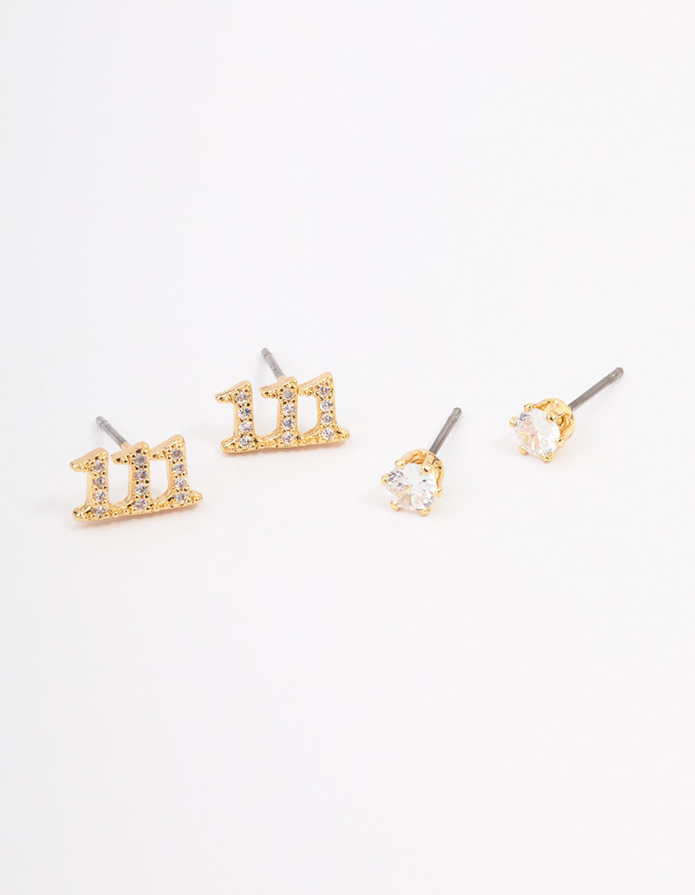 Gold Plated Cubic Zirconia Angel Number 111 Stud Earring Pack