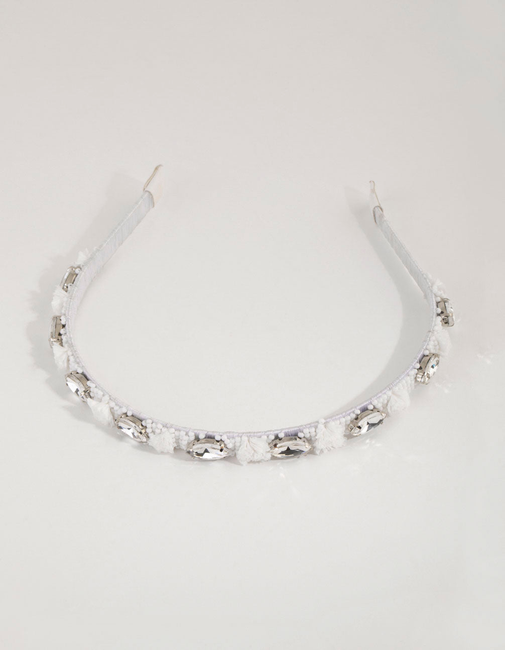 Complete your formal look with statement embellished headbands. This beautiful white alice band features a fine band with a lovely seed bead design. The pattern boasts a series of crystal-toned diamantes and white raffia details which are stationed around the band. Wear this for a soft, pretty look.