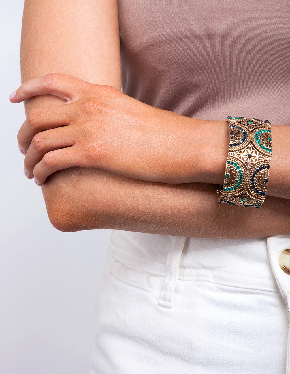A classic glimmering bracelet is essential to any wardrobe. This bracelet mixes gold tones with blue and green diamante embellishments on a filigree design.