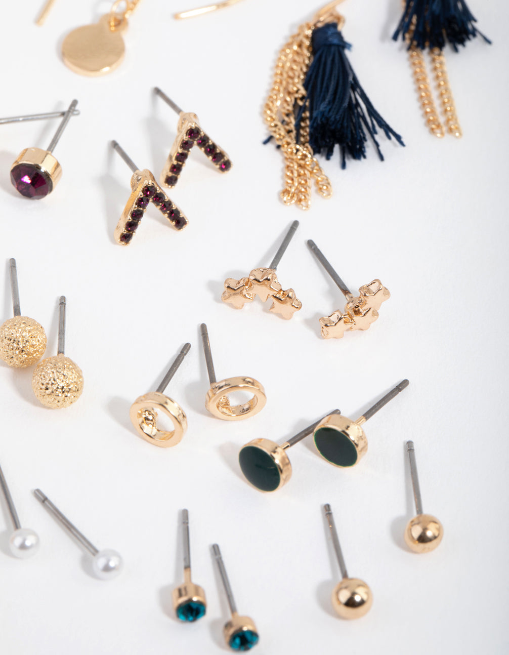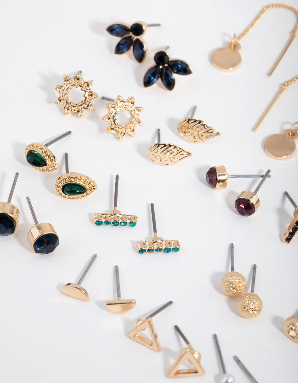 Round out your collection with a fashion-forward earring pack! This set includes 20 gold-toned stud earrings in a range of motifs, with faux opal embellishments. Stack and layer to your hearts content!