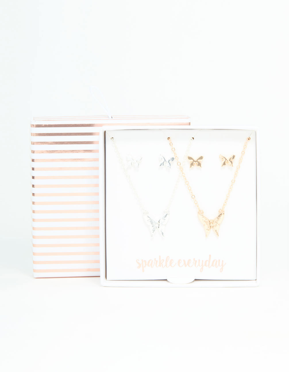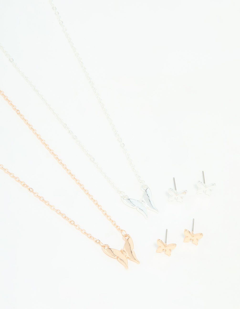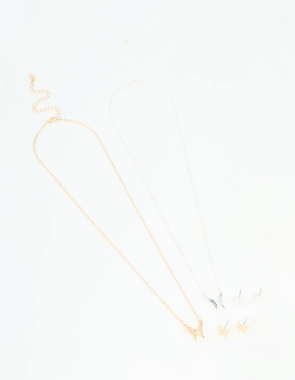 This charming set features a delicate butterfly necklace and matching stud earrings, crafted from mixed metals for a unique touch. Ideal for any occasion, it adds a playful sparkle to any outfit.