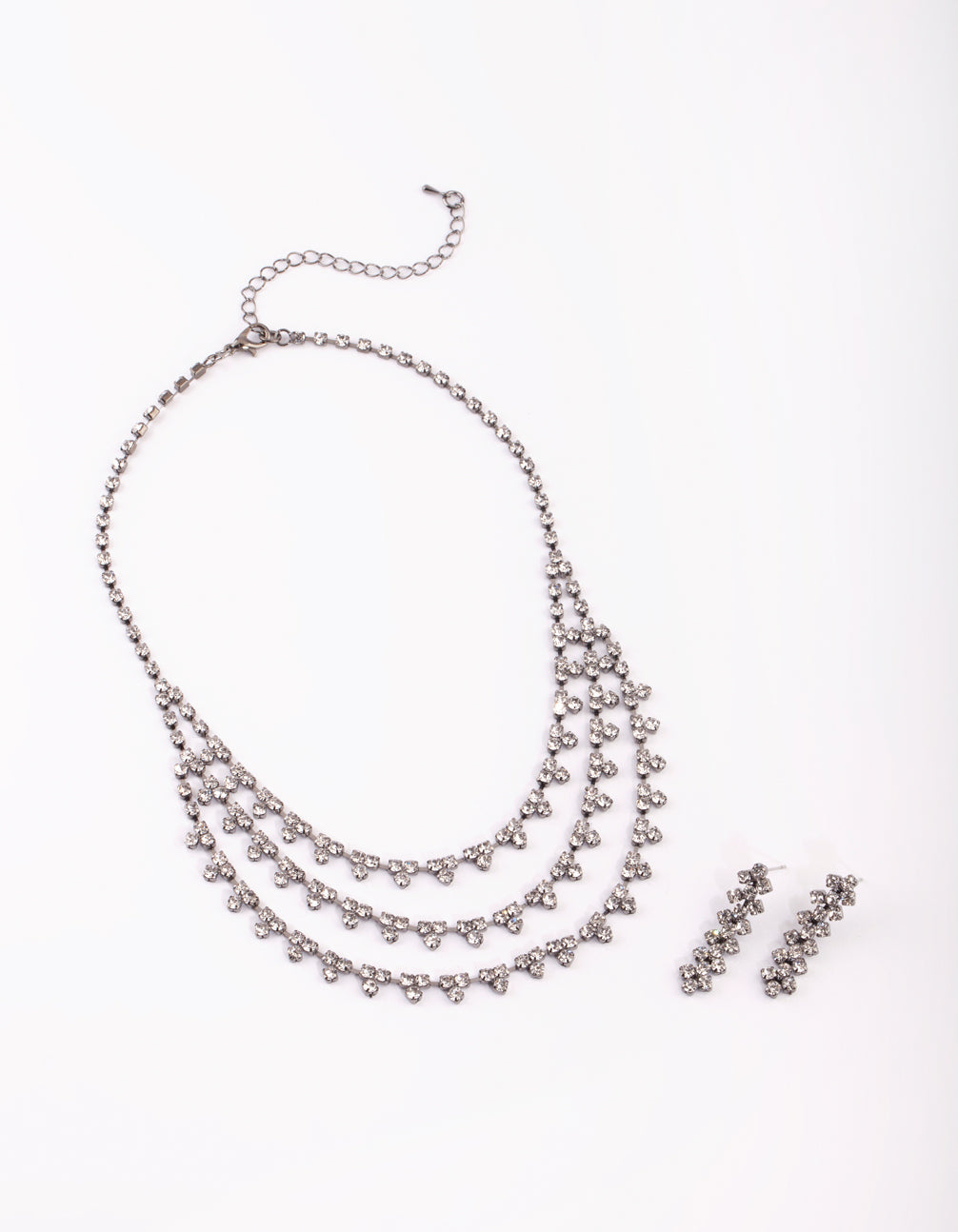 Sparkle the night away with glamorous jewellery with a dramatic edge! Featuring a dark-hued setting with an eye-catching diamante studded design, this gorgeous necklace and earrings set will take your evening look to the next level! Wear it with a pop of colour to embrace contrast, or pair it with darker hues for a 1920s glamour look.