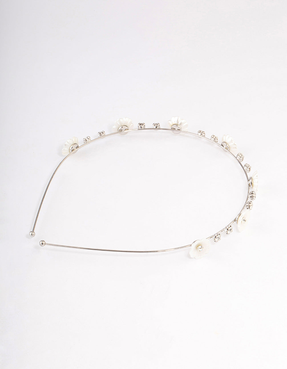 - This silver-toned headband features a dainty, pearl and diamante embellished floral design for an elevated look.