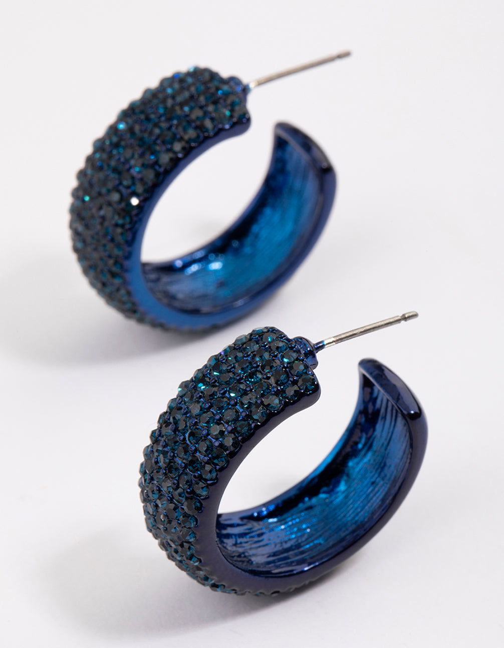 - Stand out at your next occasion with these Navy Coated Pavement Midi Hoop Earrings, designed with shiny navy accents for an eye-catching finish.