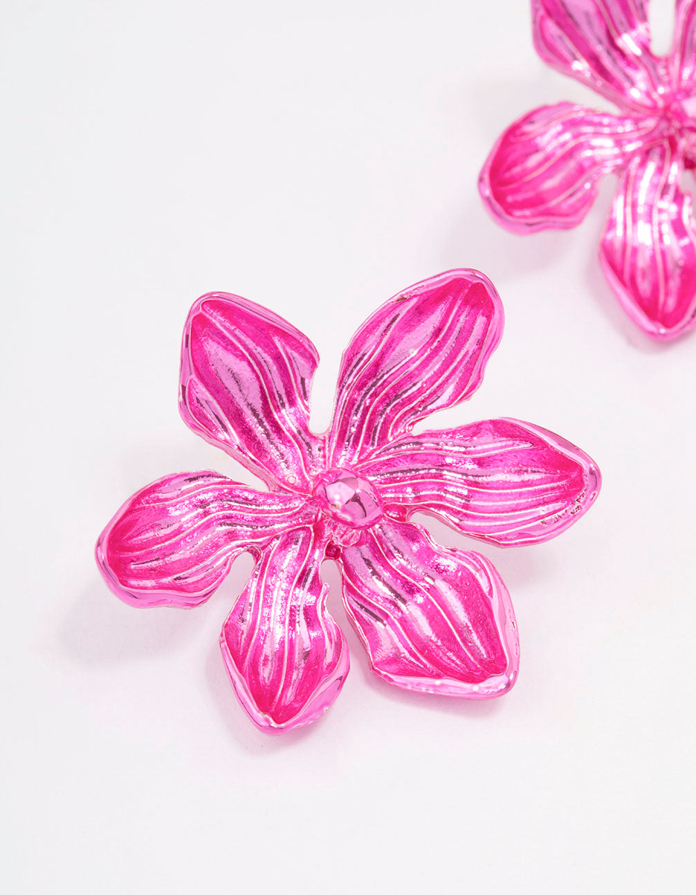 - These adorable stud earrings feature a metallic, pink flower design for a summer-inspired look.