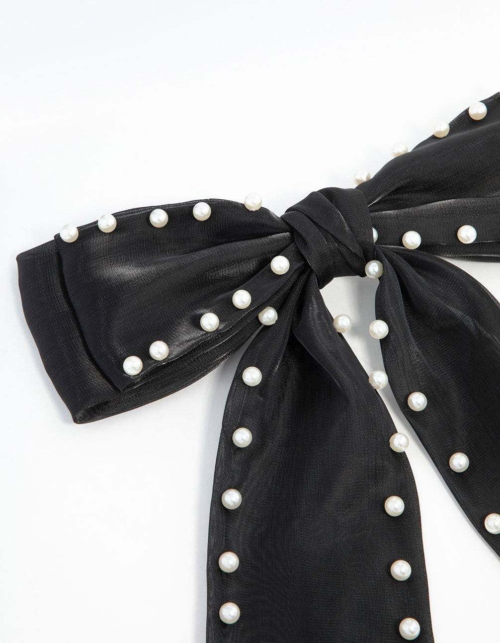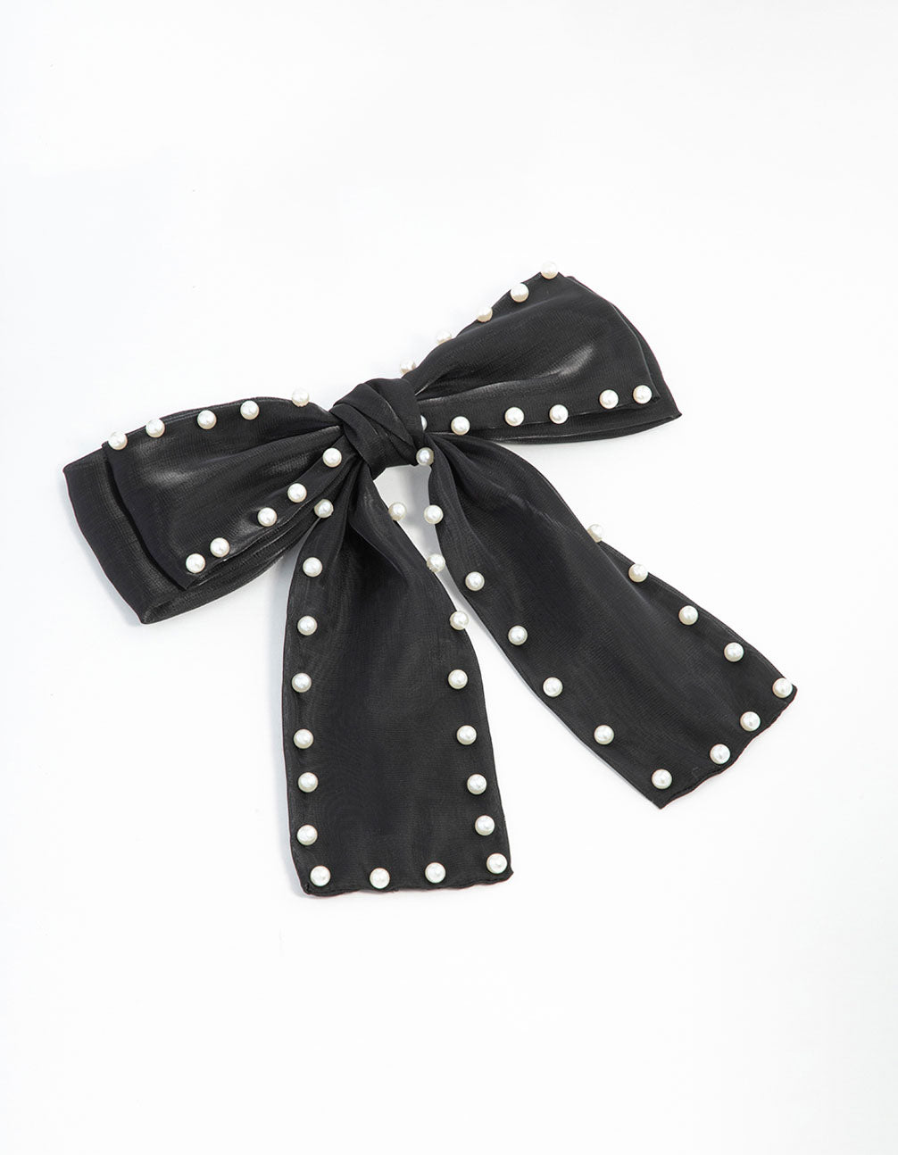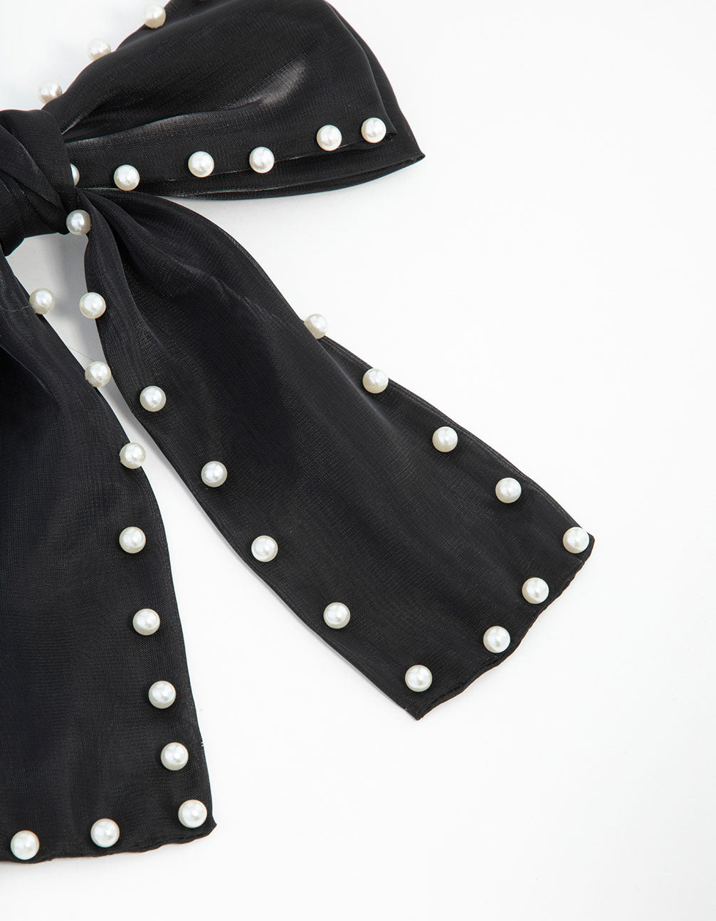 Rock some understated glamour with this beautiful black organza bow hair clip. The bow is accented with lustrous pearls for some shimmer and shine. It's crafted from high quality organza and is stylish and gentle on hair.