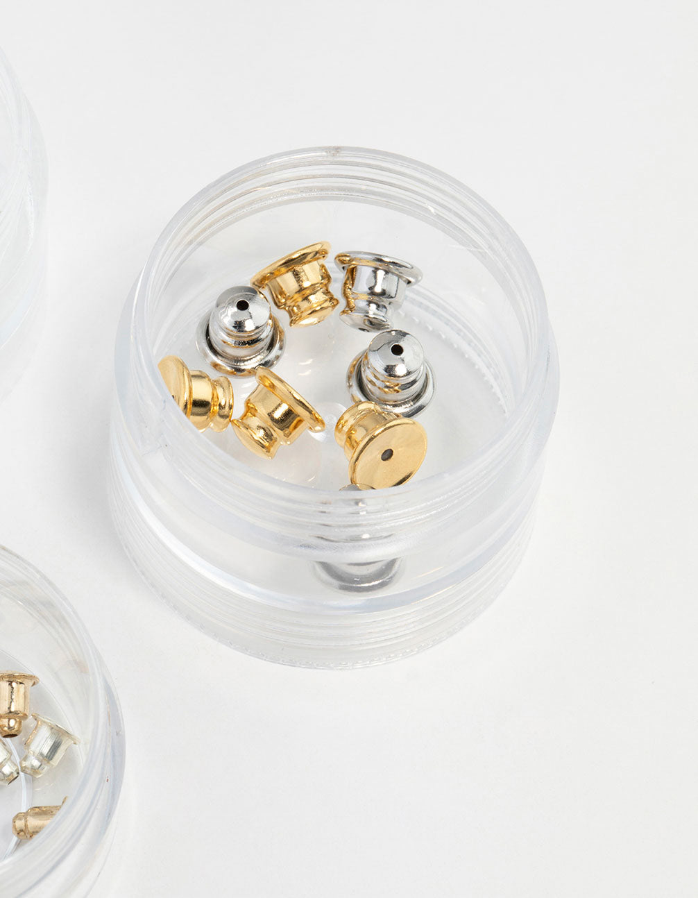 Never be without earring backs with this pack of three tubs containing Silver and Bold Bullet Backs. Designed for all-day comfort and securing your flatback earrings effortlessly. Keep them in your handbag for fashion emergencies.