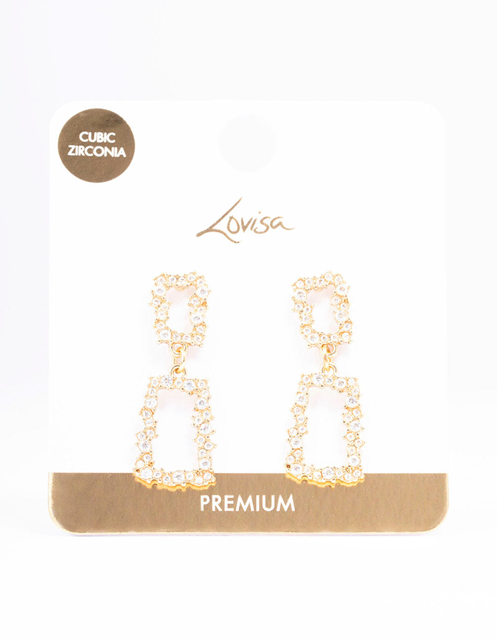 - These drop earrings are plated with real gold and feature rectangular, cubic zirconia clusters for an eye-catching finish to your stack.