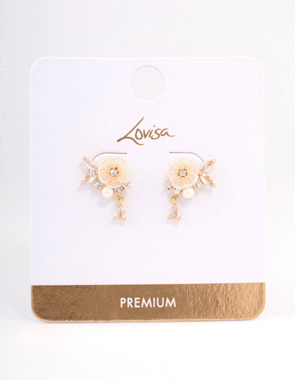Gold Plated Cubic Zirconia Floral Detailed Pearl Earrings