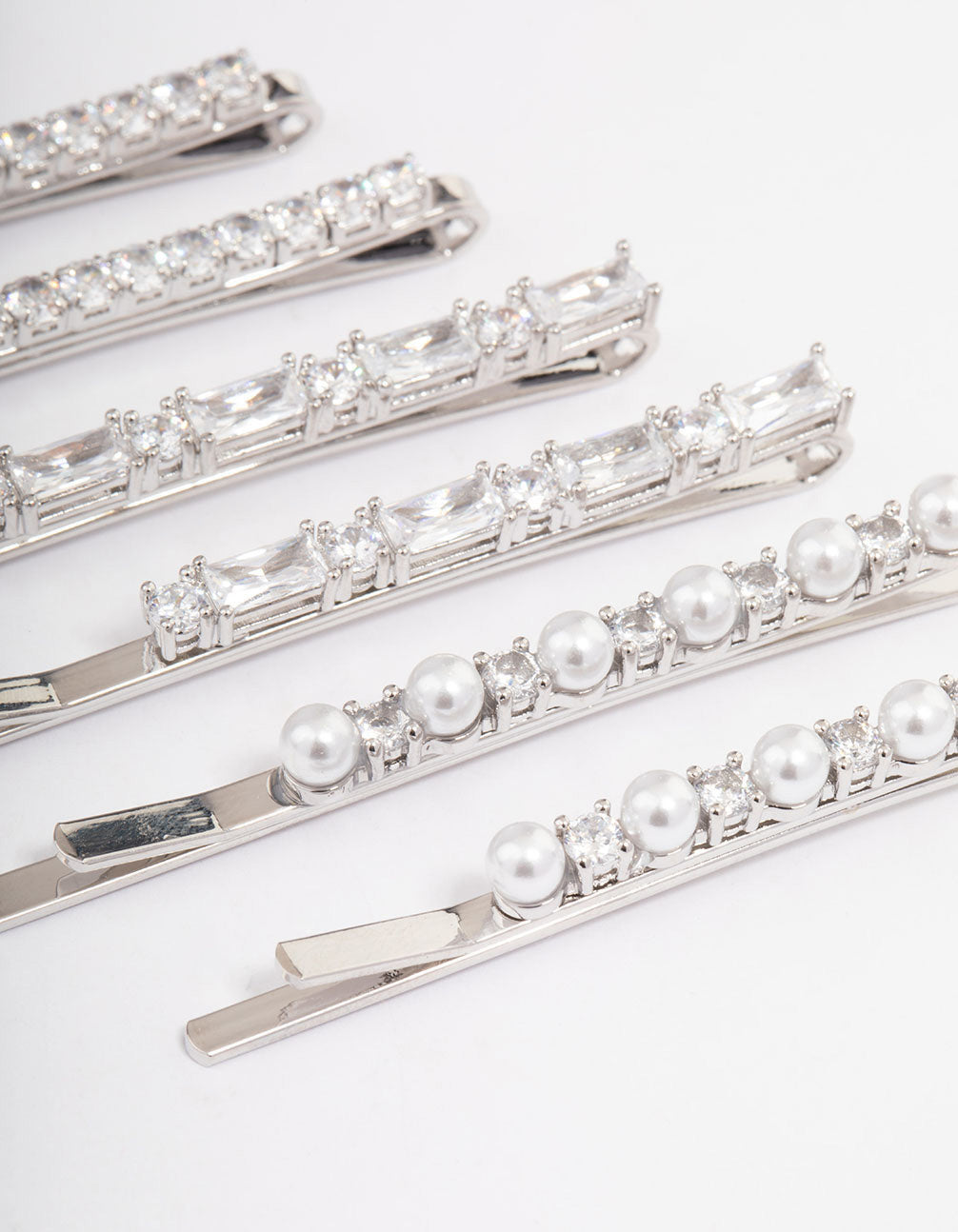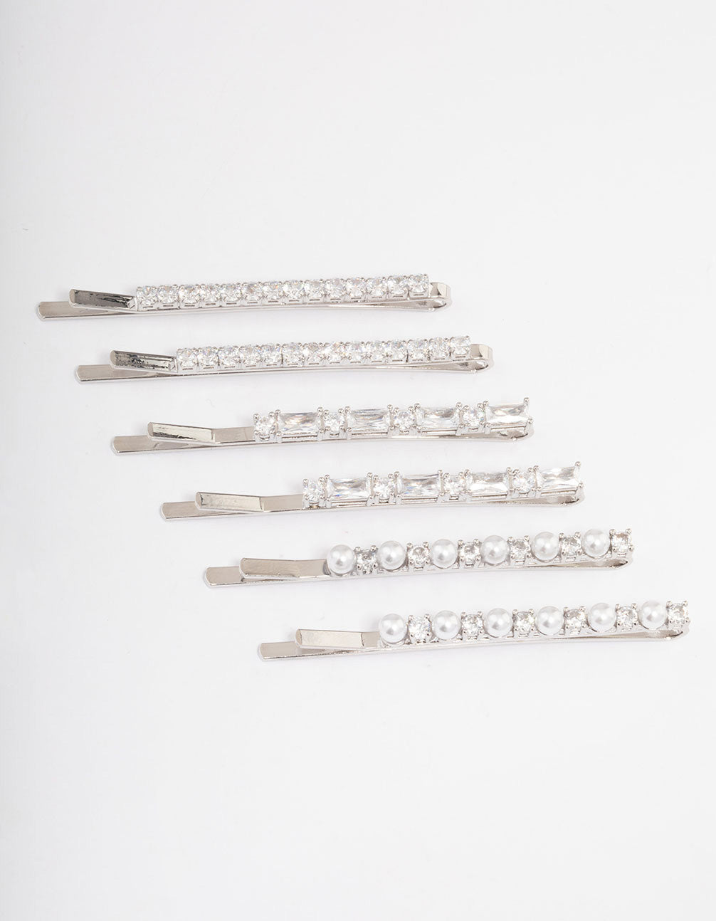 Silver Plated Cubic Zirconia Mixed Stone & Pearl Hair Clips 6-Pack
