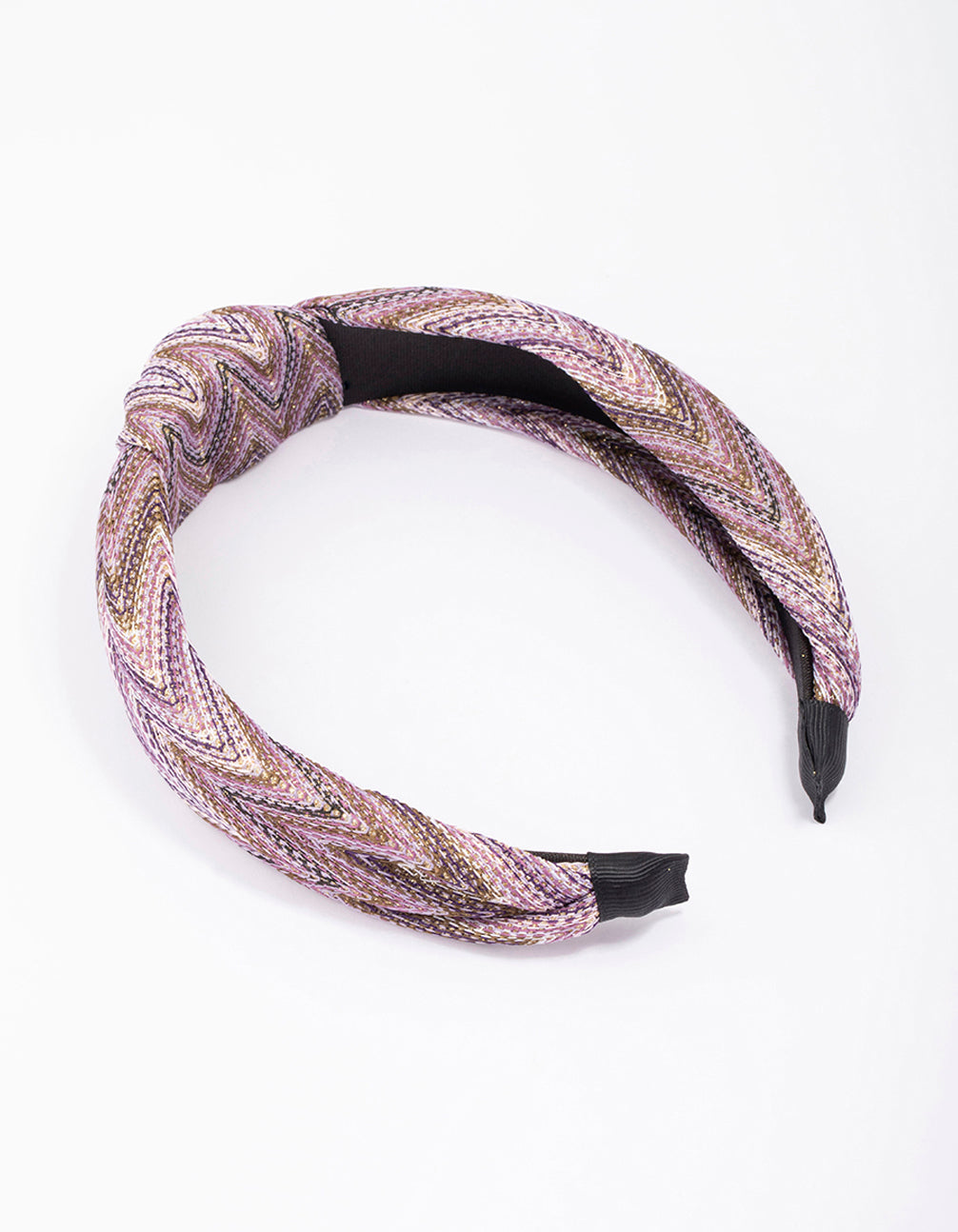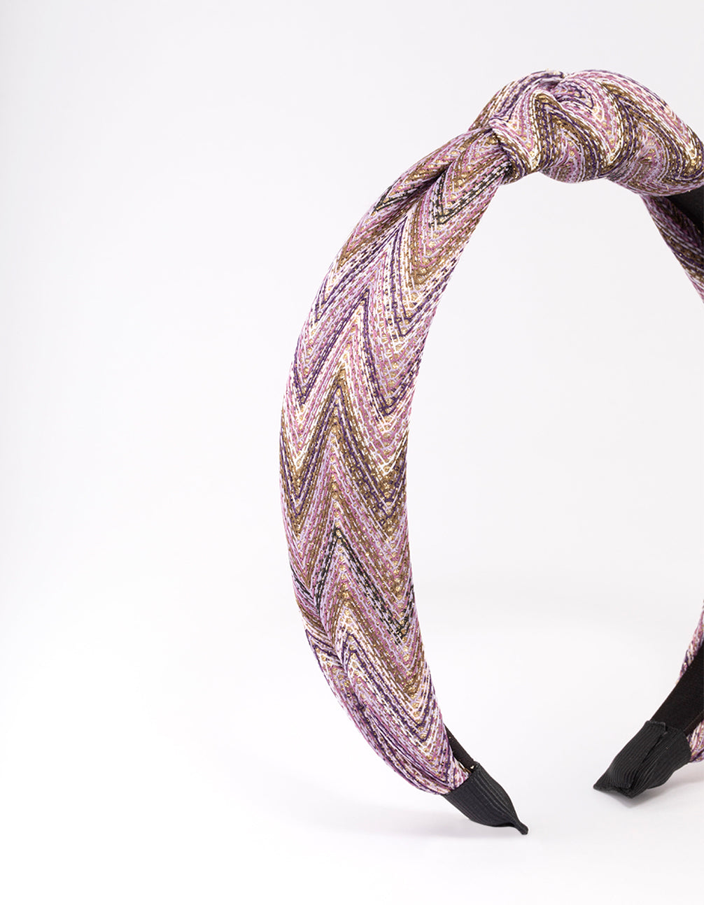 This headband features a unique, chevron pattern designed with a collection of purple and neutral hues for added interest.