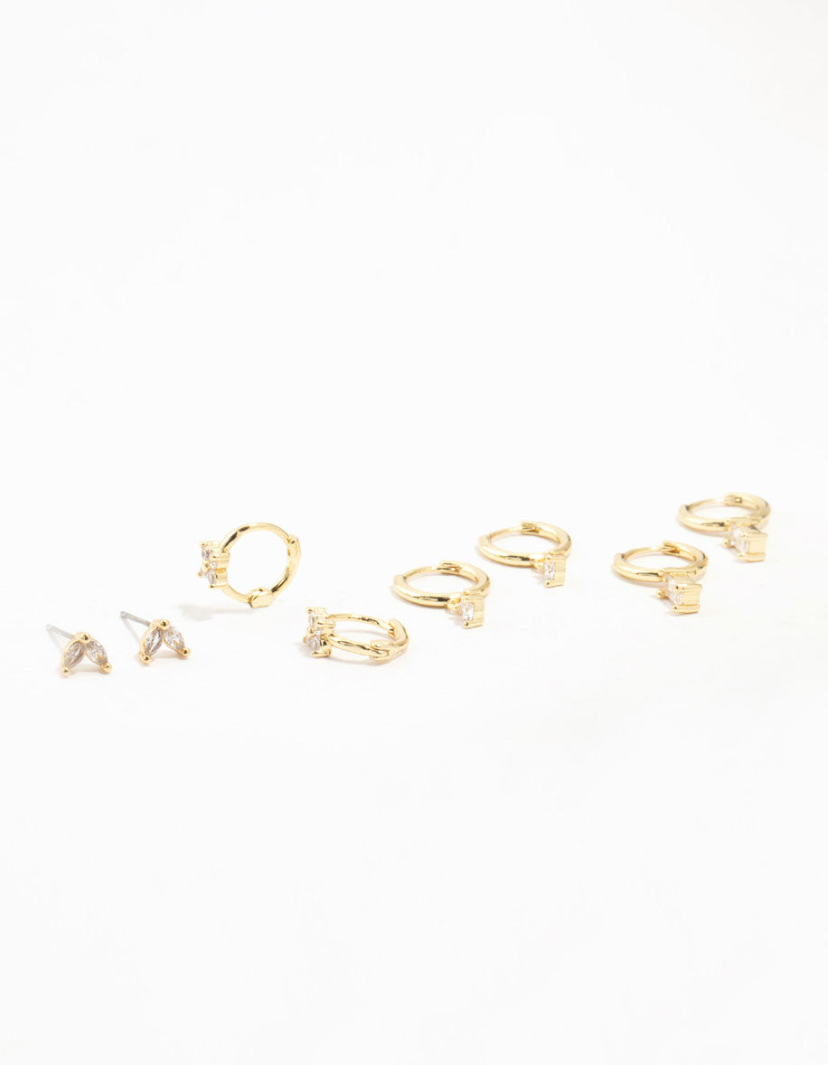Dazzle with this 4-pack of gold-plated brass hoops and studs. The baguette, flower accents and simple studs add a touch of glamour, while the stackable design lets you mix and match for endless styling possibilities.