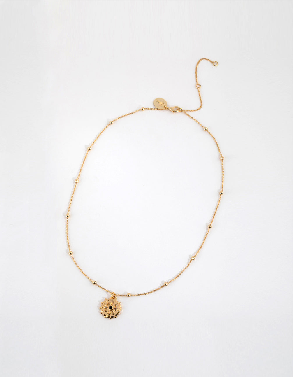This lovely necklace is plated with genuine gold for authentic lustre and shine. It features a simple chain design with sphere details and an ornate, round pendant. A black diamante sits at the centre of the pendant to inspire intrigue, and subtle moon etchings create an ethereal vibe.