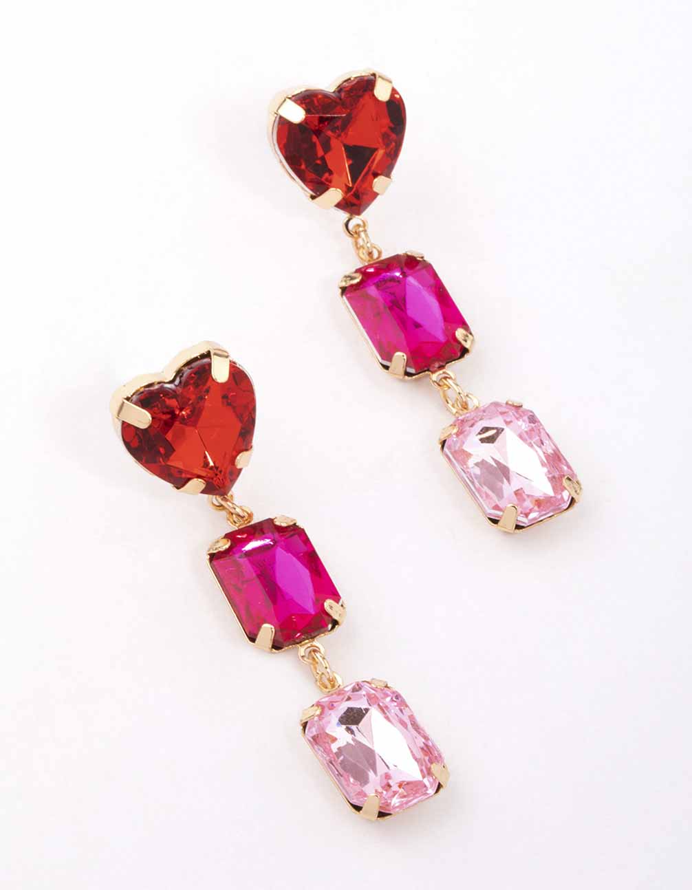 Gold Pink & Red Stone Heart Drop Earrings