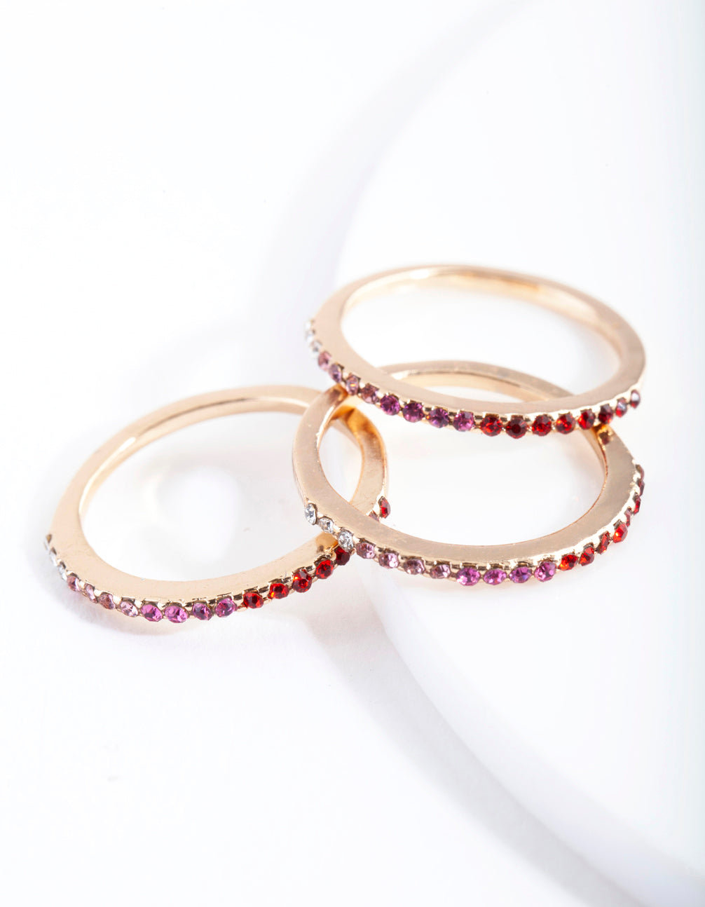 Make a statement in a stunning fashion ring. Stack with other styles for extra impact or wear alone for a refined addition to your ensemble. This ring pack boasts 3 gold-toned rings with red ombre diamante embellishments.