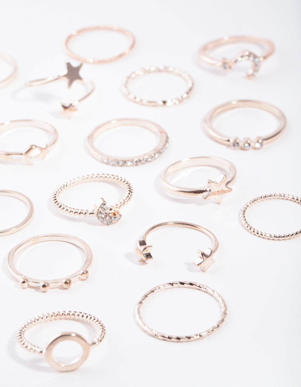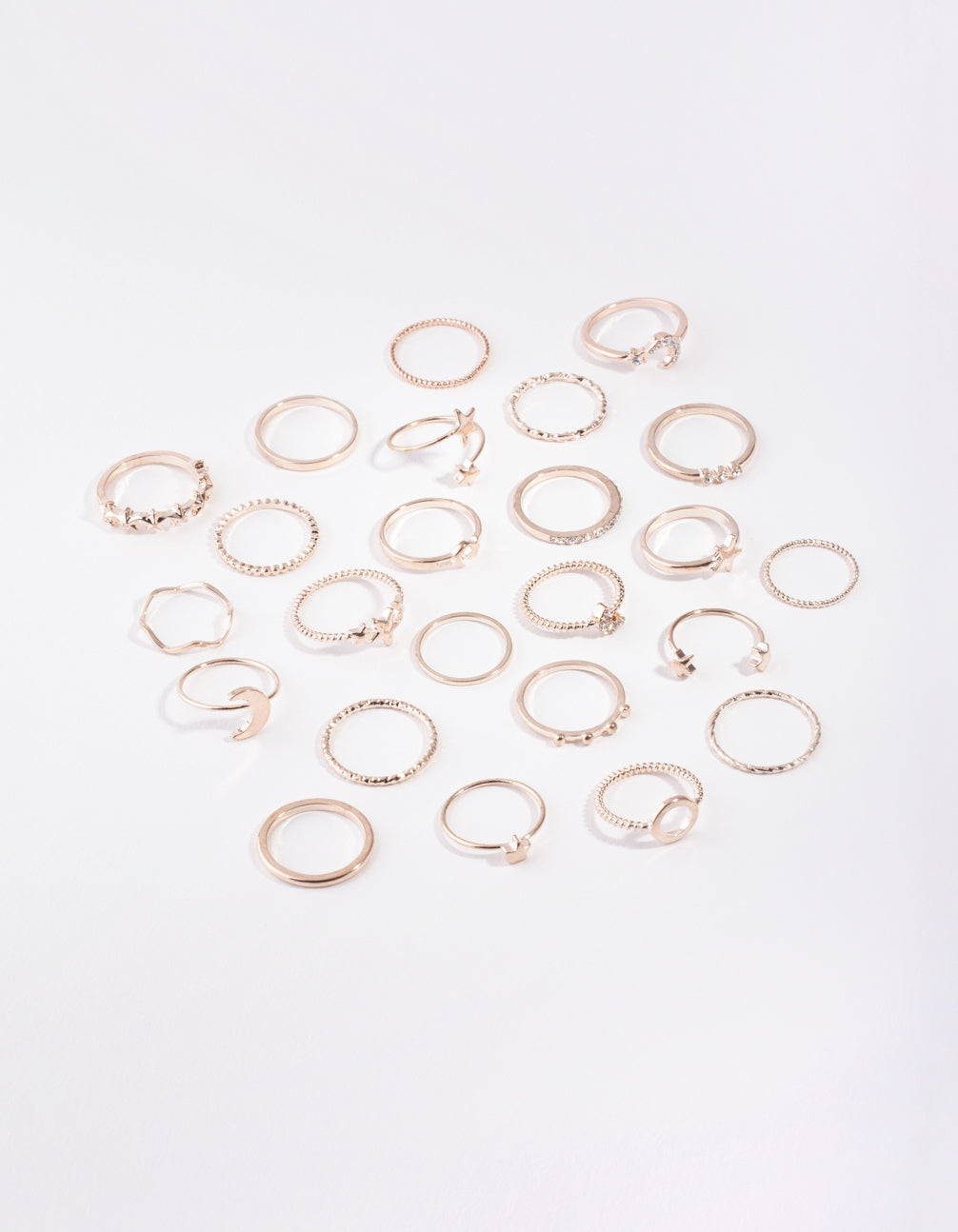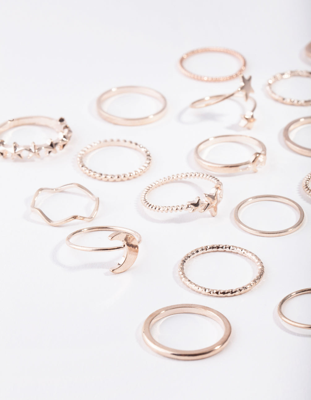 Stay ahead of the latest ring stacking trends with our multi ring stack packs. This stunning rose gold-toned pack features a celestial motif and will have you shining from day to night.
