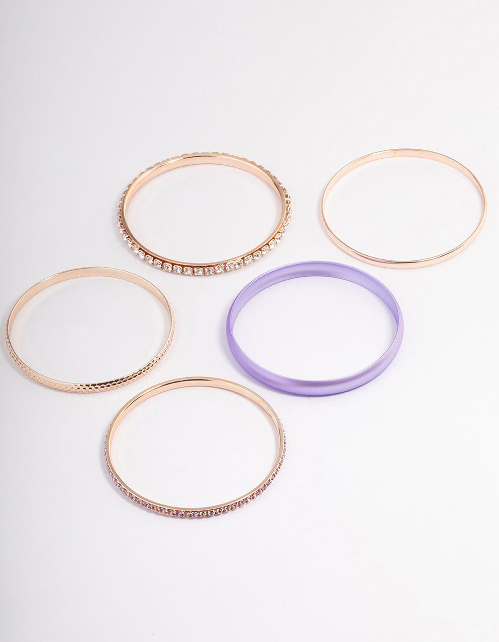 - This rose gold bangle pack contains five individual, diamante embellished bangles, designed to be layered together for a stacked look.